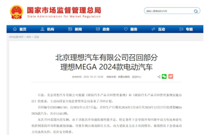 10月31日,理想汽车宣布召回11411辆2024款MEGA车型,召回原因直指冷却液防腐性能不足可能引发的动力电池热失控风险。