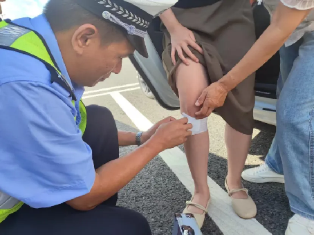 10月3日,包茂高速柏桥服务区西区停车场,一名旅客膝盖不慎受伤。协管员李国聪发现后,立马拿上医疗箱,现场帮刘女士包扎处理伤口。