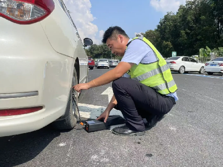 10月1日,乐广高速黎溪服务区经理周耀超为胎压异常车主王先生,免费检测并调试轮胎气压,烈日下蹲地操作10分钟,获车主朋友圈点赞“暖心守护者”。