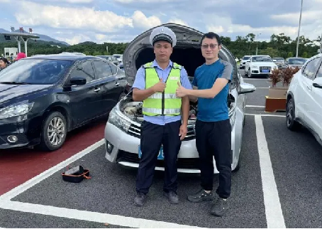 10月2日,包茂高速柏桥服务区东区停车场,从湛江前来服务区游玩的王先生车辆突然熄火,立马向附近的协管员张恒昌求助。最终,张恒昌利用专业工具,成功搭电将车辆启动。