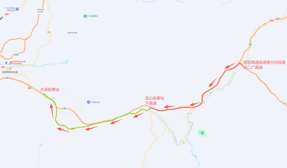 12月15日下午6时至12月25日下午6时,可由连贺高速湖南方向匝道进入二广高速至连山站下高速,绕行G234国道至太保站进入高速。
