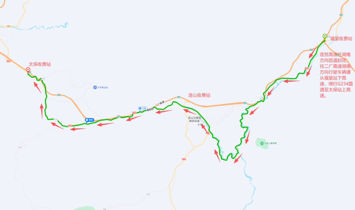 2.需从连贺高速往二广高速湖南方向行驶的车辆,11月26日上午8时至12月15日下午6时,请从福堂站下高速,绕行G234国道至太保站进入高速。