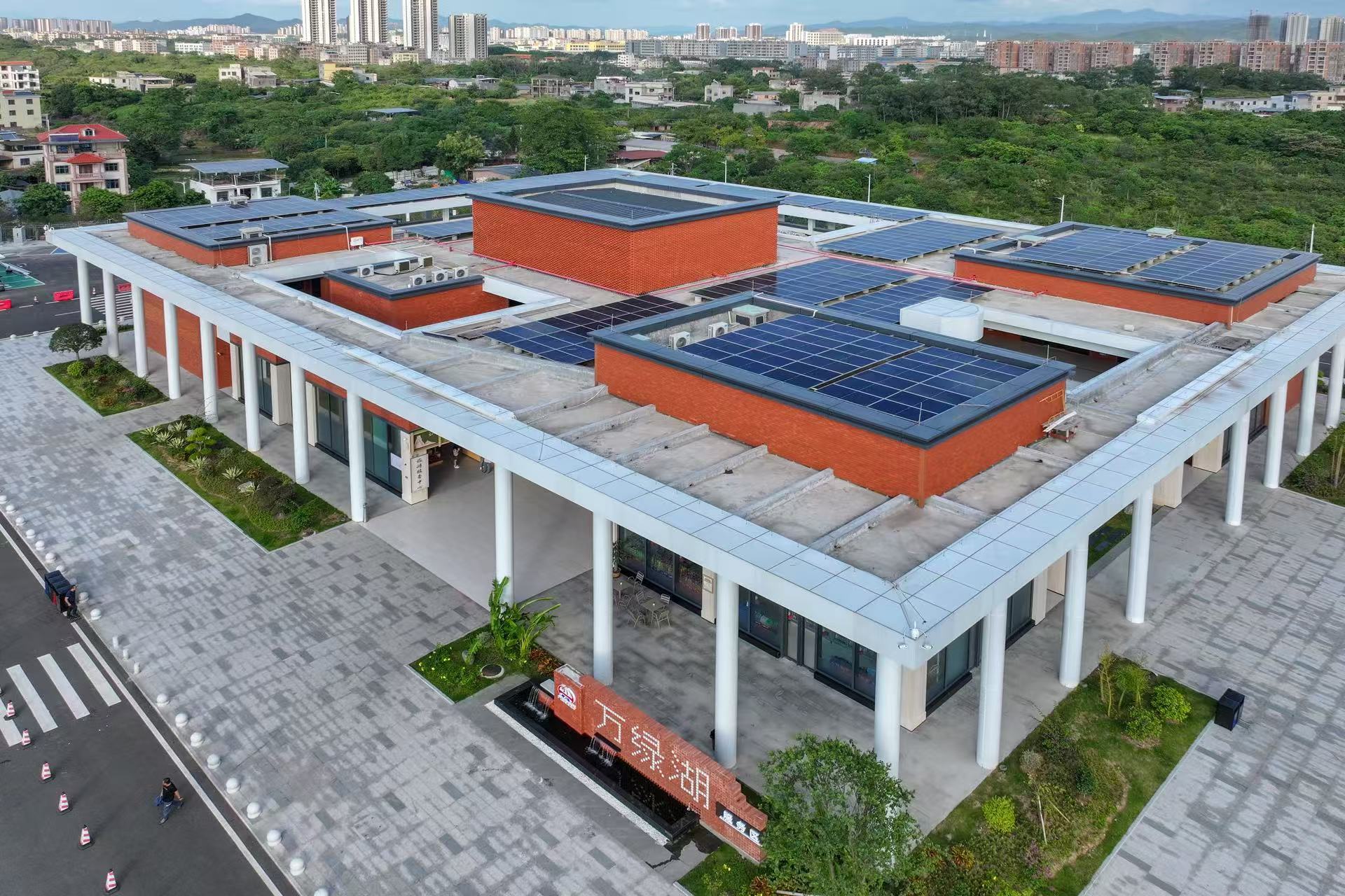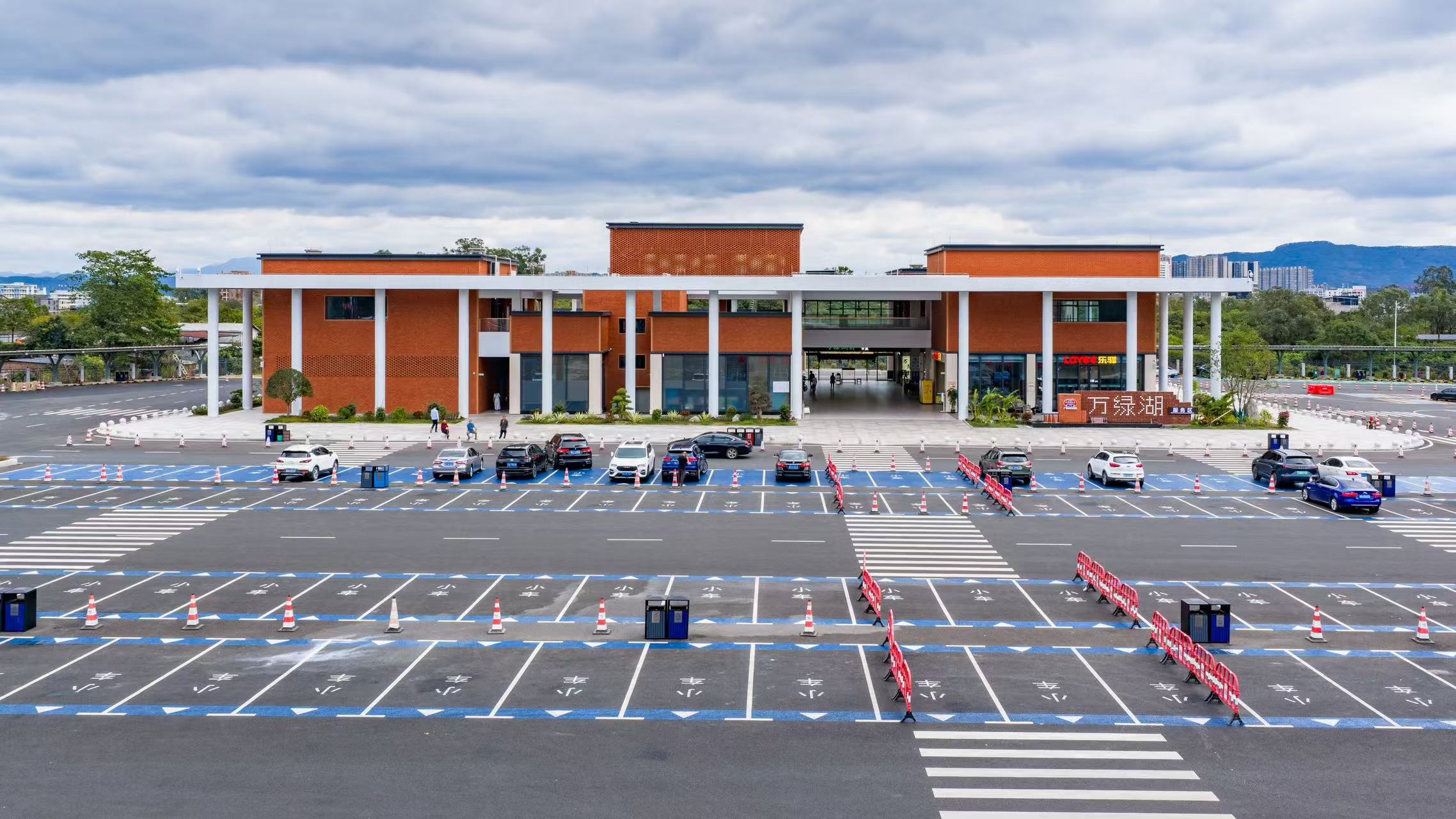 万绿湖服务区以绿色低碳为主题,项目建设期用于智慧梁场生产的光伏组件,已“搬家”至此继续“服役”,实现了服务区绿色供能。服务楼内设置了庭院景观及玻璃水幕,呼应河源万绿湖“绿水绕浮岛”生态景观,引入地方旅游服务中心,为过往旅客提供周边景点推介、特色民宿预订等服务,将高速出行与深度出游无缝对接。