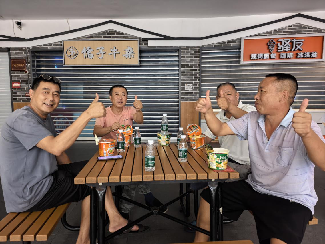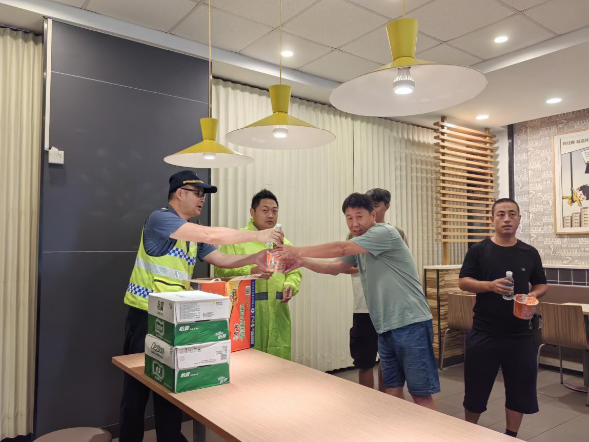 路政中队长王超果断调整方案,决定从“劝离疏导”转为“暖心保障”。他第一时间带领队员将所有滞留的车主和旅客劝离引导至主楼室内临时安置点休息、避险,远离露天停车场的树木倒伏、广告牌坠落风险。同步启动应急服务,建立“卡友微信群”,免费为司乘人员提供热水、泡面、矿泉水及提供手机充电服务,解决基本生活需求。同时在微信群内实时播报台风动态和路网解封进展,并提供工作人员电话供大家紧急联系。