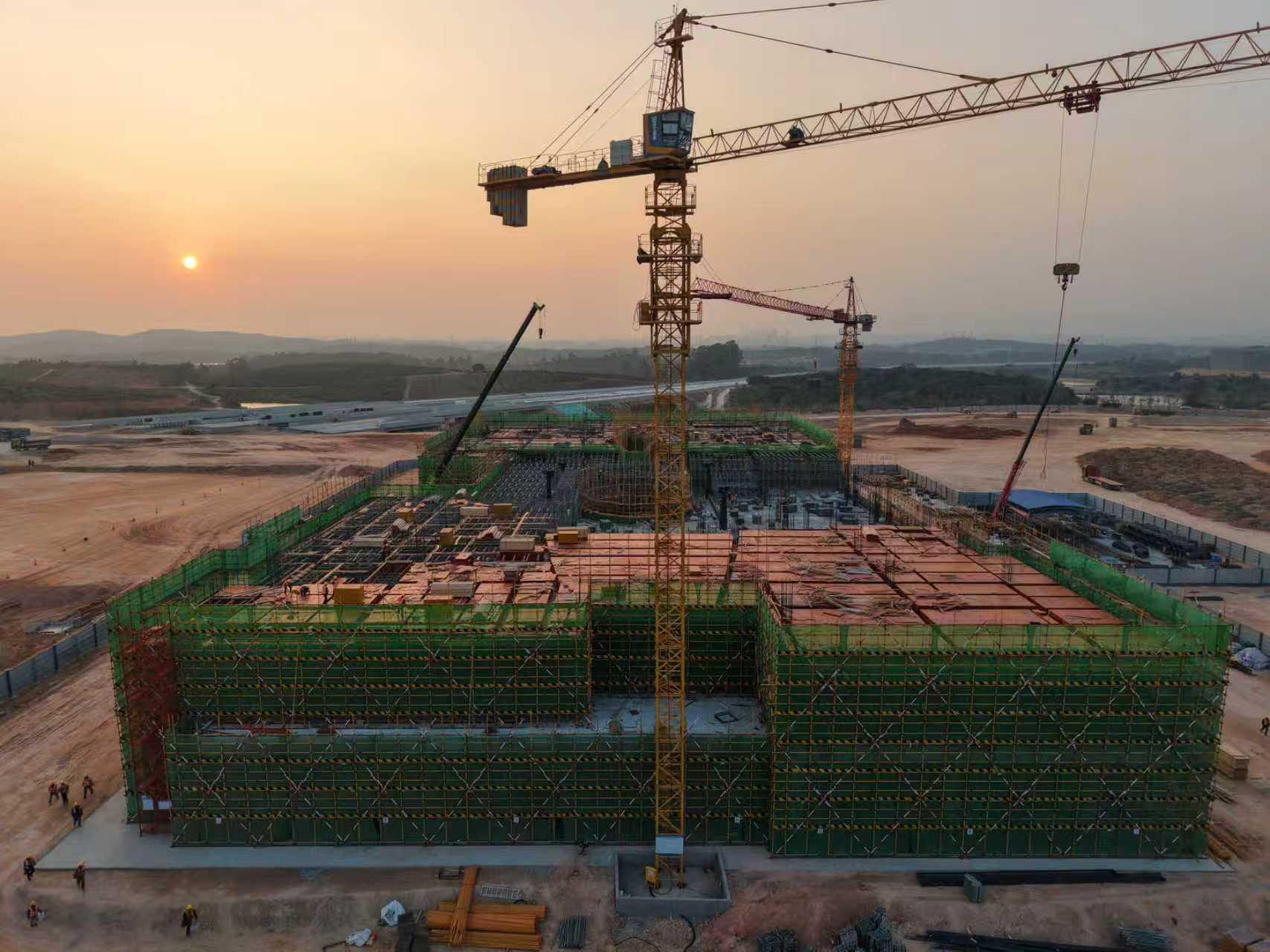 三层立体结构房建工程体量庞大、施工工序繁杂,且需面对交叉作业等诸多挑战。项目团队通过分区段、多作业面并行推进模式,优化资源调配与施工方案,提升施工效率,在保障工程质量与安全的前提下,近500名建设工人奋战120天,成功实现主体结构封顶,为后续房建工程推进按下“加速键”。