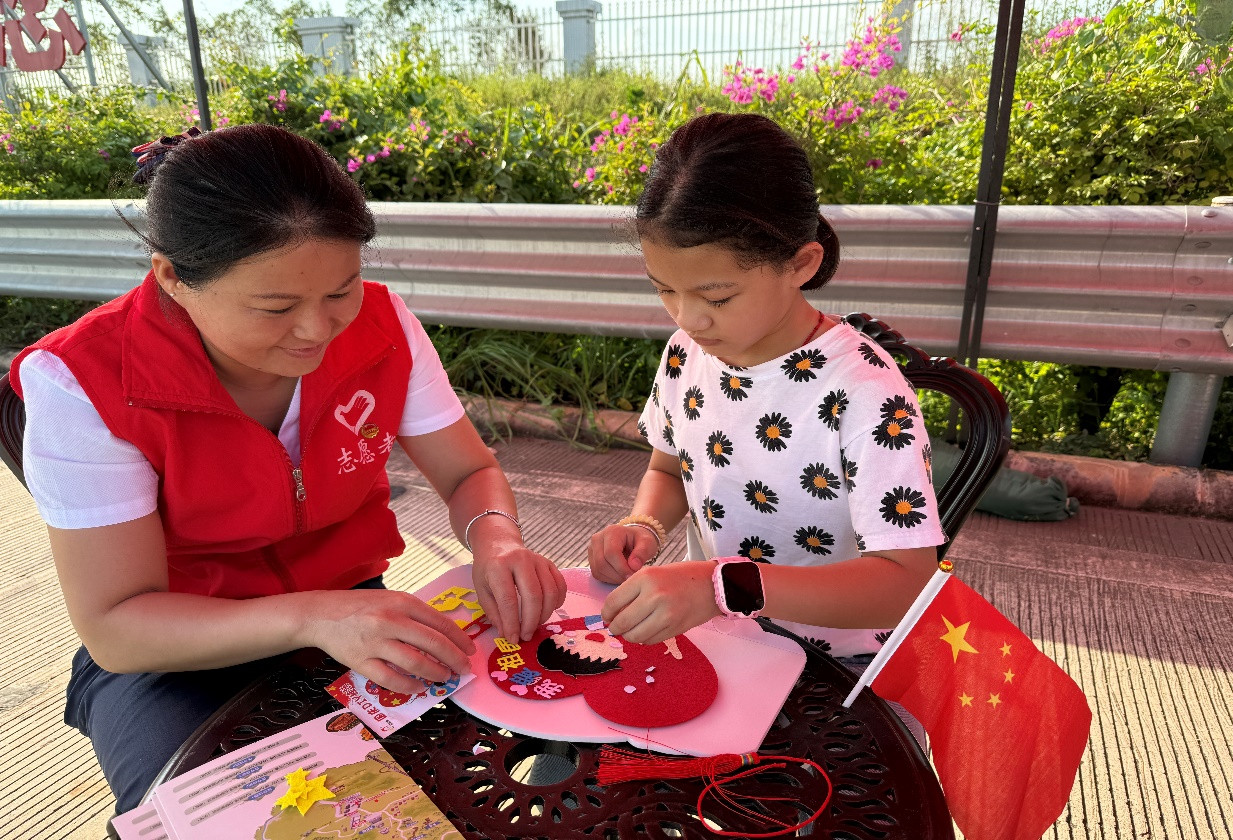 茂湛高速机场北站志愿者指导孩子制作祝福祖国贺卡。
