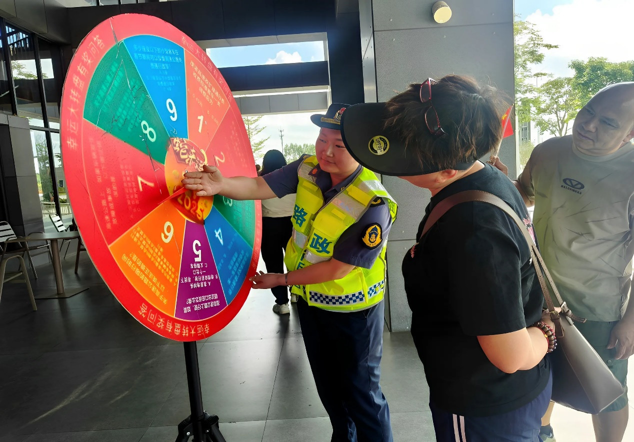 “我来回答!这题我知道……”面对志愿者提问,参与者踊跃抢答,气氛热烈。答对者收获了精美纪念品,在欢声笑语中掌握并巩固交通安全知识,欢快的气氛很好地缓解广大司乘人员长途旅行的疲惫感。