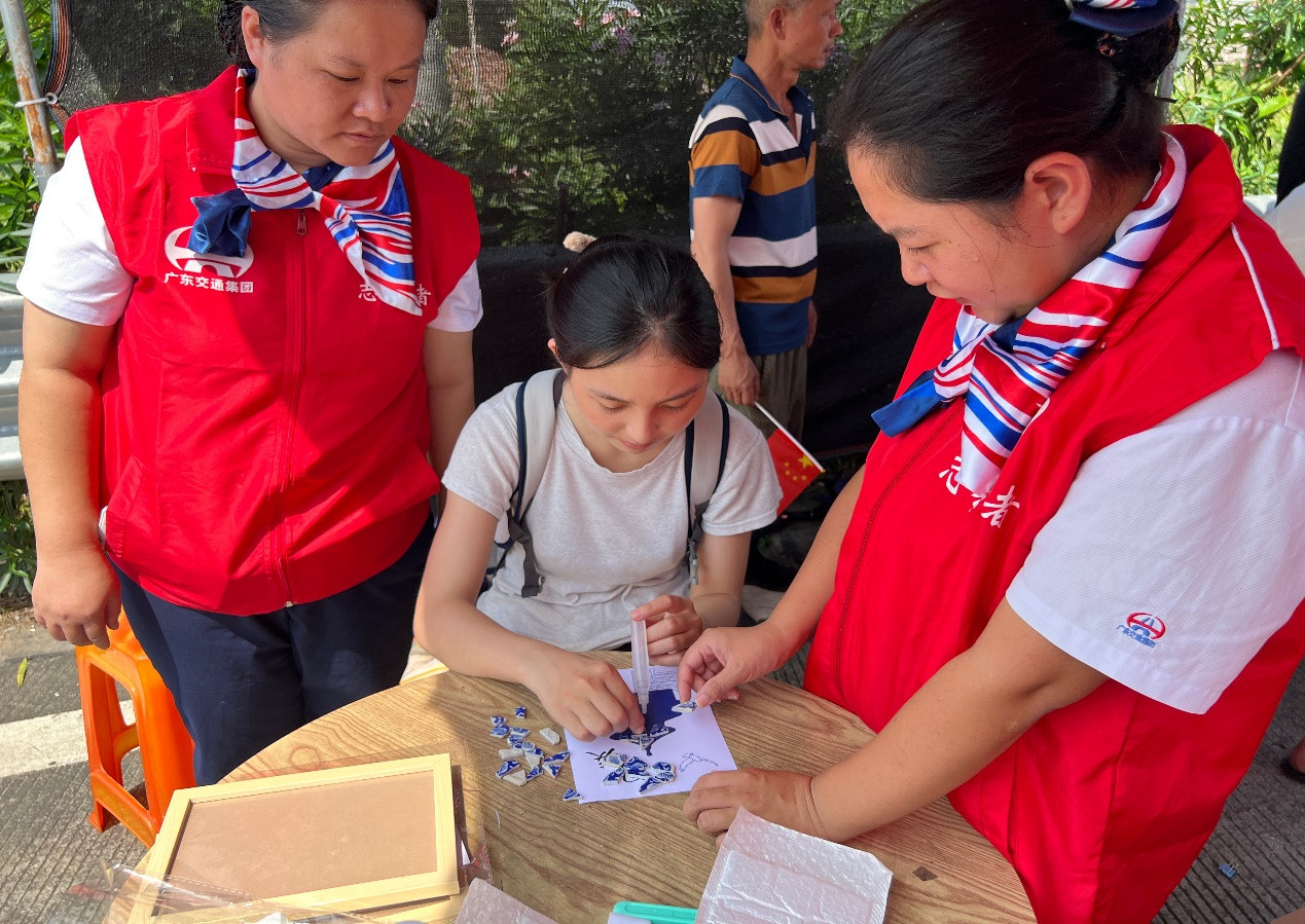 在茂湛高速浅水站服务点,志愿者准备了非遗陶瓷画活动。旅客用青花瓷碎片巧手拼贴出“喜迎国庆”“红船精神”“盛世华诞”等主题陶瓷画,尽显青花瓷典雅之美。