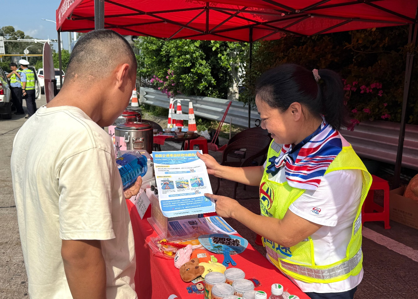 “师傅,这是道路交通安全指南,您可以了解一下。”针对“双节”期间车流较大特点,茂湛、包茂高速联合属地高速交警、交通运输等部门在多个服务区、站场服务岗等设立“交通安全普法宣传点”,通过现场讲解超速、疲劳驾驶、占用应急车道等违反交规的危害性,并结合典型事故案例以案释法,倡导文明驾驶。志愿者还针对老人、孩童特别讲解过马路和乘车注意事项,叮嘱勿搭乘非法营运车或超载车。
