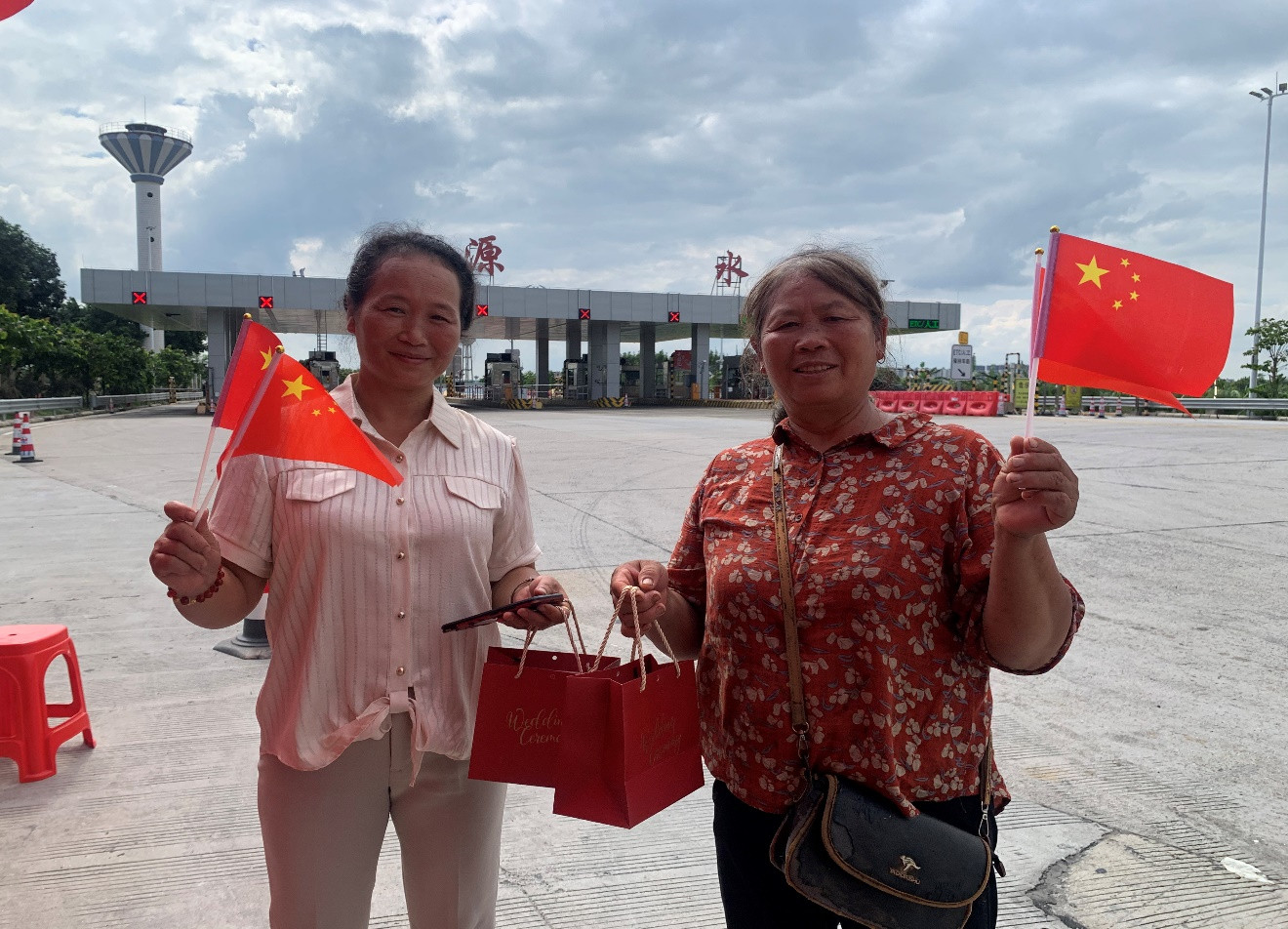 在茂湛高速源水站便民服务点,收到自制月饼的旅客群众开心留影