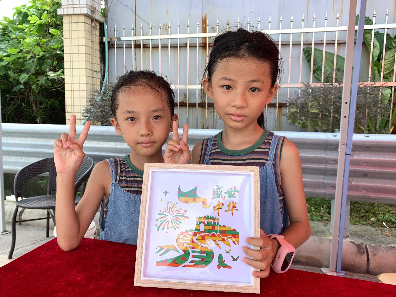 小旅客们在茂湛高速体验竹编画制作并展示作品