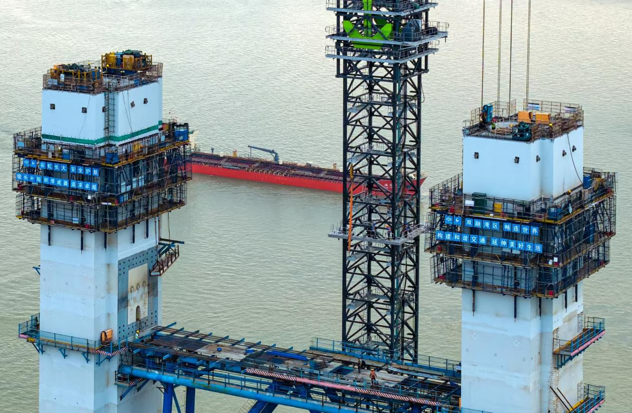 穿云又越海,这背后,少不了一个个造桥“神器”的加持。桥梁塔柱施工,国产超大型塔式起重机让索塔安全、高效“拔节生长”。施工人员轻触屏幕,即可完成吊装自动纠偏;超长变焦摄像头与智能跟踪技术,有效解决了视觉盲区与远距离操作难题,确保对接误差控制在毫米级;智能爬升平台以其全封闭结构、抗风稳定性与集成化设计,为施工人员提供了安全的操作空间。