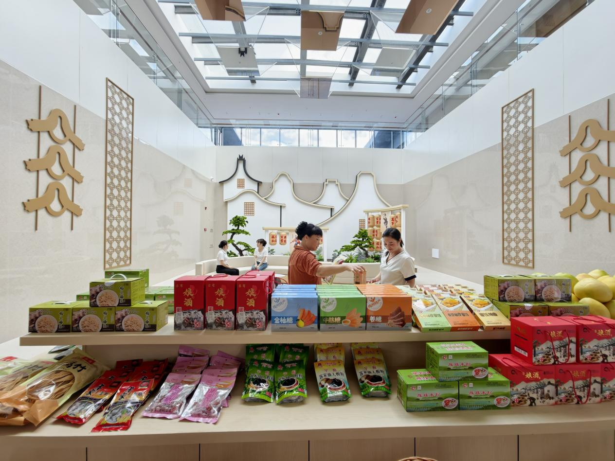 东西两区都设有“潮客好礼文化馆”,中式的装修风格让人感受到浓浓的客潮氛围。西区文化馆门口的左边摆着一面中式大鼓,让人想起了潮汕英歌舞;东区文化馆右边则是水车装饰小景,唤起游人乡情。半人高的货架上摆满了200余种客潮两地名优特产,有清甜多汁的金柚、传统酿造的五华娘酒、品种丰富的潮汕糕点等等。旅客不仅可以当场品尝,还能带回家当手信,感受地道的客潮风味。