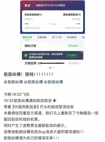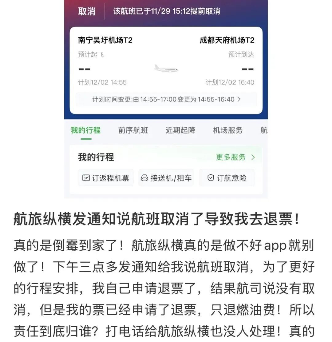 “航旅纵横大面积误发通知”的消息冲上多个平台热搜。多名网友在社交平台反映,在11月29日15:00左右收到来自航旅纵横的航班取消提醒,部分用户在重新购票后才发现,实际航班并未取消,而是由于航旅纵横出现系统故障,推送了错误信息。不少用户因此额外承担了票价差价及退票手续费。