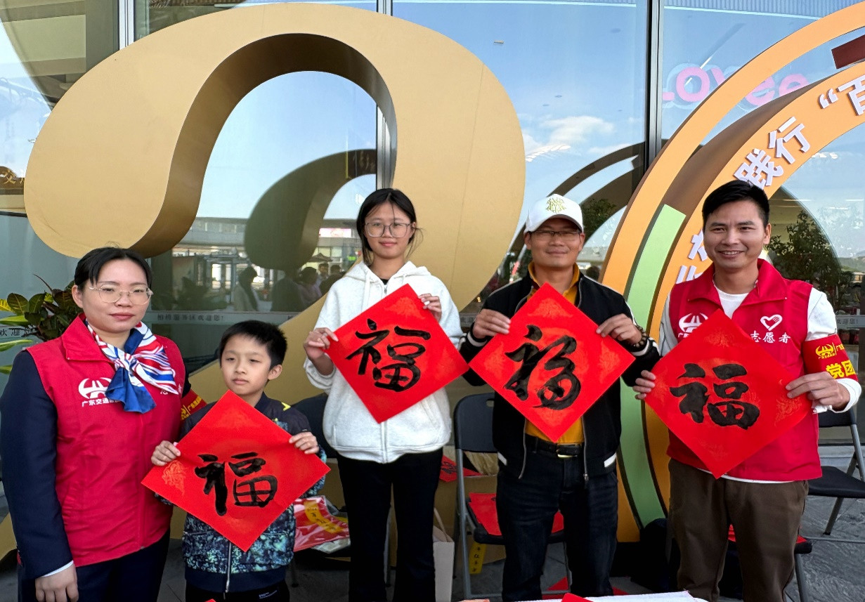 包茂高速柏桥服务区元旦志愿服务现场,志愿者在“墨香送福”环节引导孩子们感受书法魅力;获得手拿“福”字的李先生开心与志愿者合影。