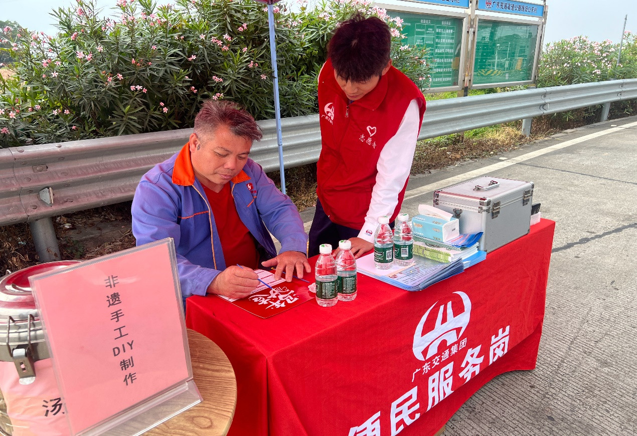元旦假日,茂湛高速浅水站志愿者邀请途经司乘人员体验马年日历描绘手工制作。