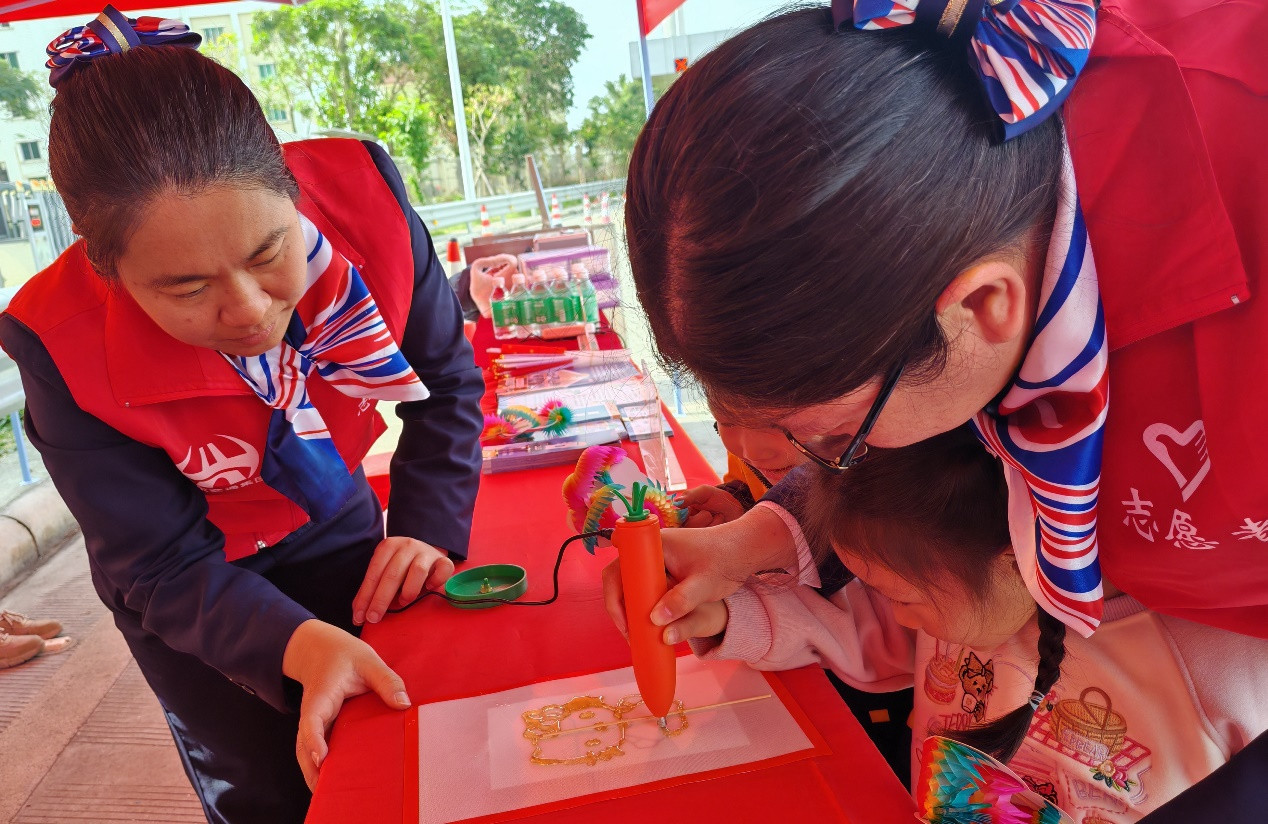 元旦节假日期间,茂湛高速官渡站志愿者耐心教导孩子们体验糖画制作之乐。