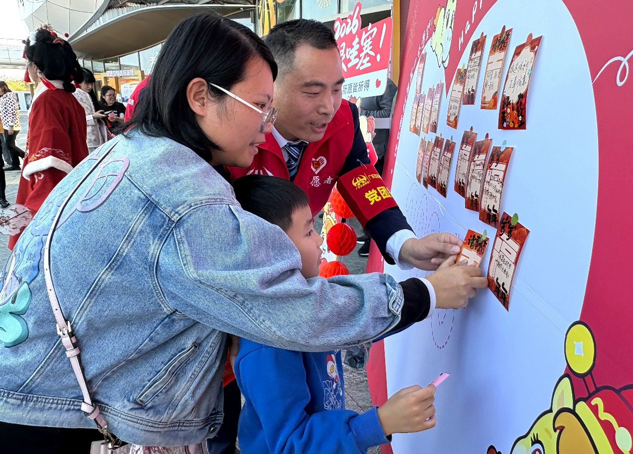 活动创新采用“打卡闯关”形式,设置三个趣味环节营造人气“爆棚”节日气氛。在“墨香送福”关,志愿者即席挥毫写 “福”送福,邀请小朋友执笔体验,墨香四溢间传递新年祝愿。第二关“非遗拓印画”最受亲子家庭青睐,选模板、涂颜料、压宣纸,幅幅印有马年吉祥图案拓印作品跃然纸上,孩子们兴奋地举起成果展示,家长们用镜头定格欢乐瞬间。“心愿打卡墙”更添温情,“考试100分”的童真期许、“长长久久”的甜蜜告白、“出行平安”的朴实祝愿……张张便签满载浓情蜜意贴满墙面,汇成温馨的新年风景线。
