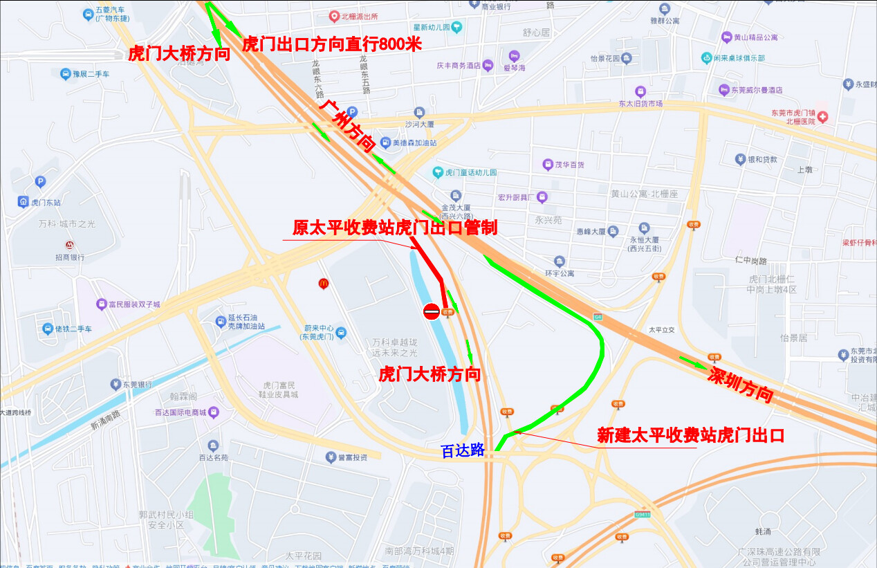 1、广州往深圳方向计划从太平收费站虎门出口驶离的车辆,请沿广深高速公路主线继续前行800米,从新出口驶离。
