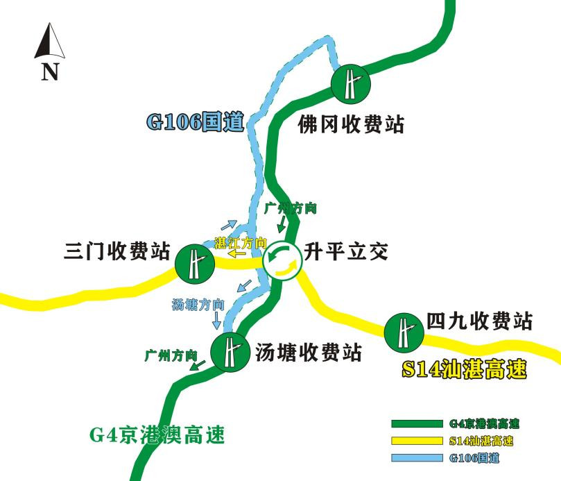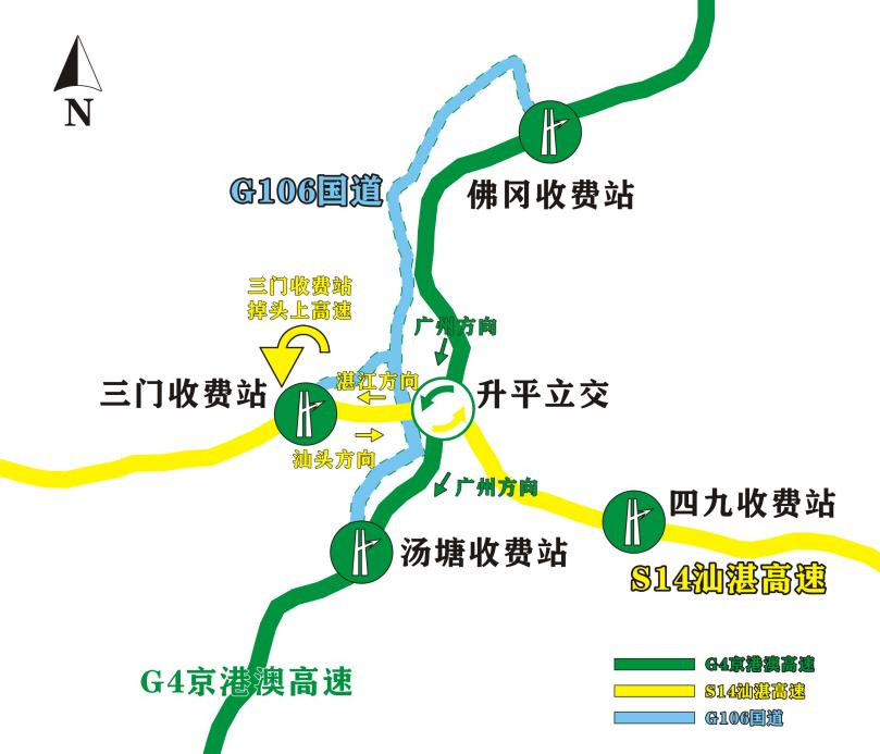 备选方案:从升平立交绕行至S14汕湛高速往湛江方向→三门收费站→G106国道往汤塘方向→汤塘收费站→G4京港澳高速往广州方向。