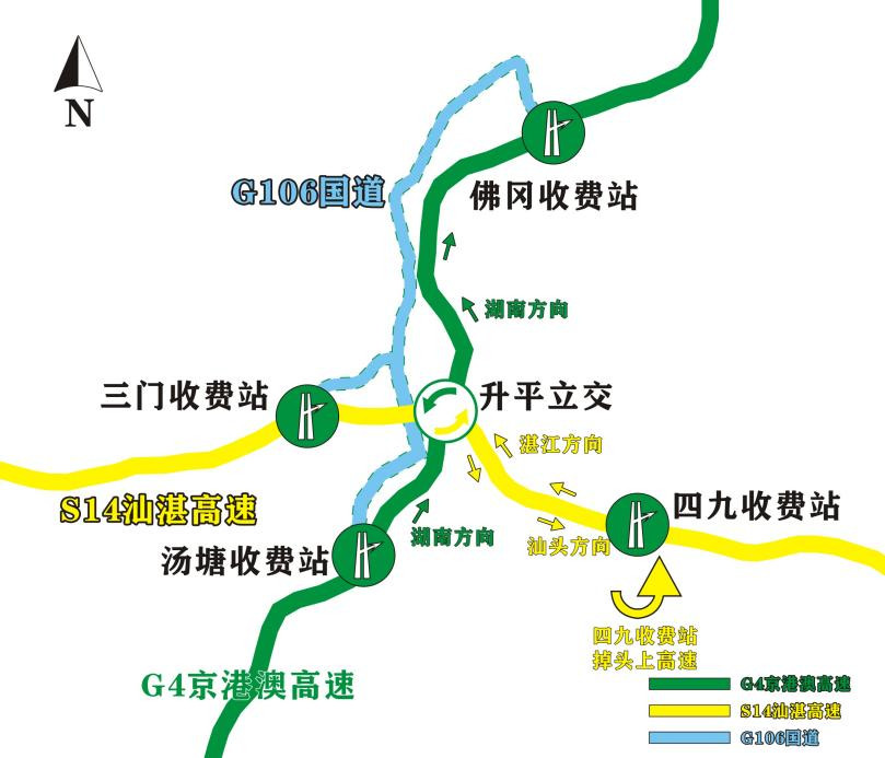 推荐方案:从升平立交绕行至S14汕湛高速往湛江方向→三门收费站→G106国道往佛冈方向→佛冈收费站→G4京港澳高速往湖南方向。