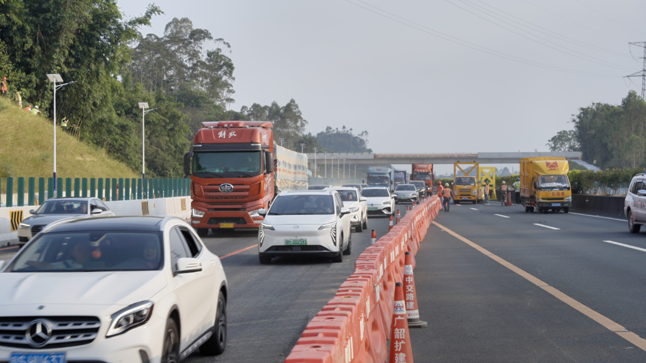 10月10日下午4点30分,在广东交通集团所属广韶高速改扩建项目(南段)交通导改路段现场,伴随着警车的提示鸣笛声,车辆有序通行,标志着全线首次大规模交通导改任务圆满完成,正式迈入“左幅双向通行,右幅封闭施工”的新阶段,为项目高效推进奠定了坚实基础。