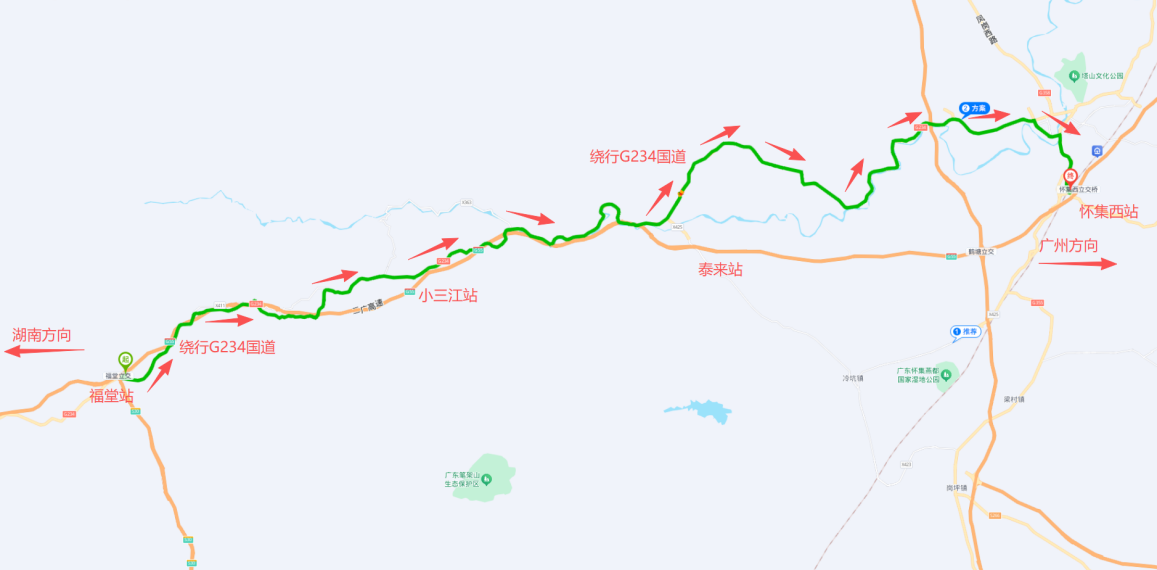 封闭期间绕行线路:二广高速往广州方向行驶的车辆以及连贺高速往二广高速广州方向行驶的车辆请绕行地方公路(G234)至怀集西站进入高速。