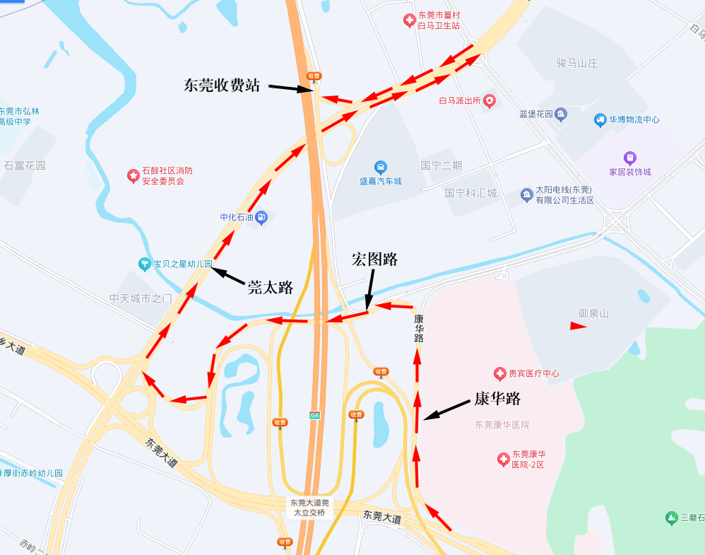 路线四:东莞大道→康华路→宏图路→莞太路→东莞收费站广州入口