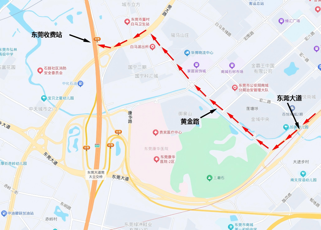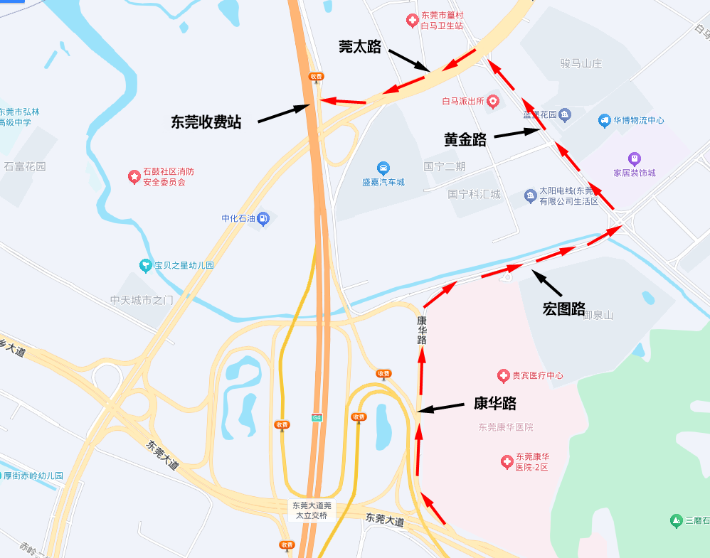 路线三:东莞大道→康华路→宏图路→黄金路→莞太路→东莞收费站广州入口
