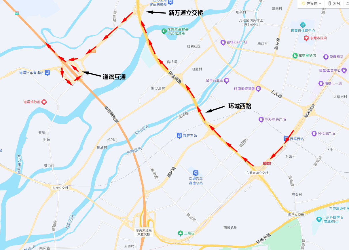 路线二:东莞大道→环城西路→新万道立交桥→道滘收费站