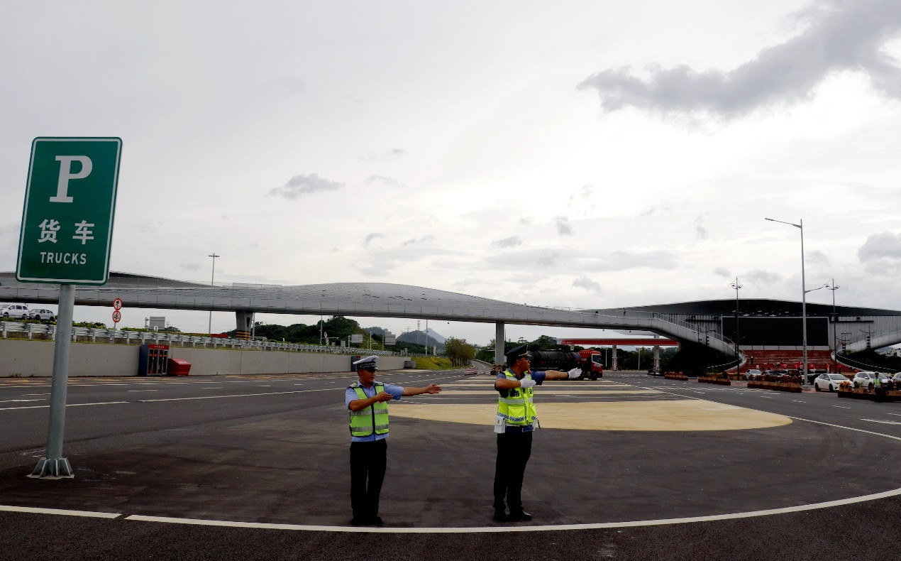 路政人员在柏桥服务区入口前做好车辆管控指挥工作 摄影者:曾浩阳