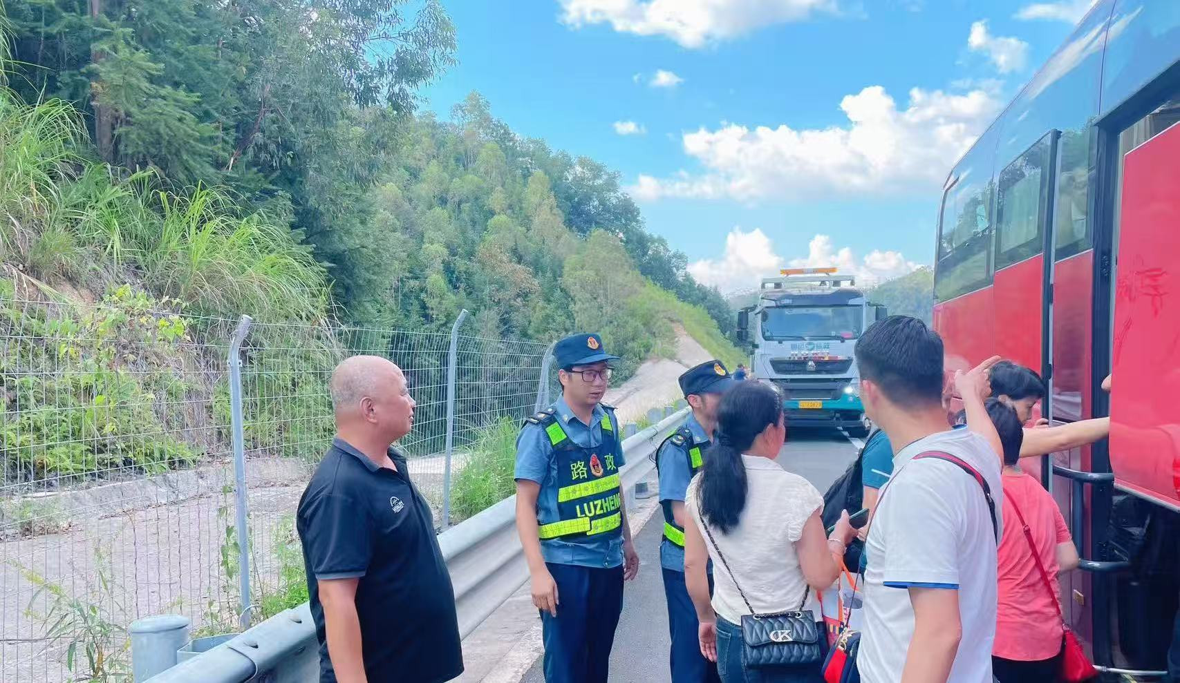 15时12分,路政人员林巨达和郑子杨抵达现场,发现一辆粤M牌大巴车停在第三车道,部分乘客在应急车道等候。两人分工协作:一人迅速设置安全警示区,引导乘客转移至护栏外的安全区域;另一人则上前了解情况。