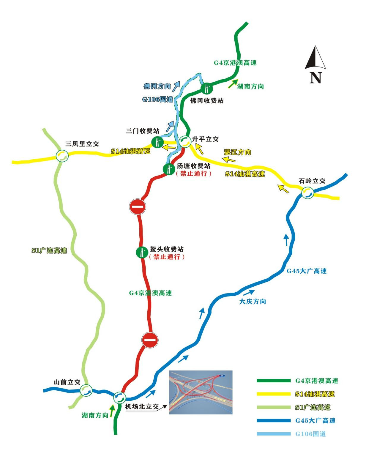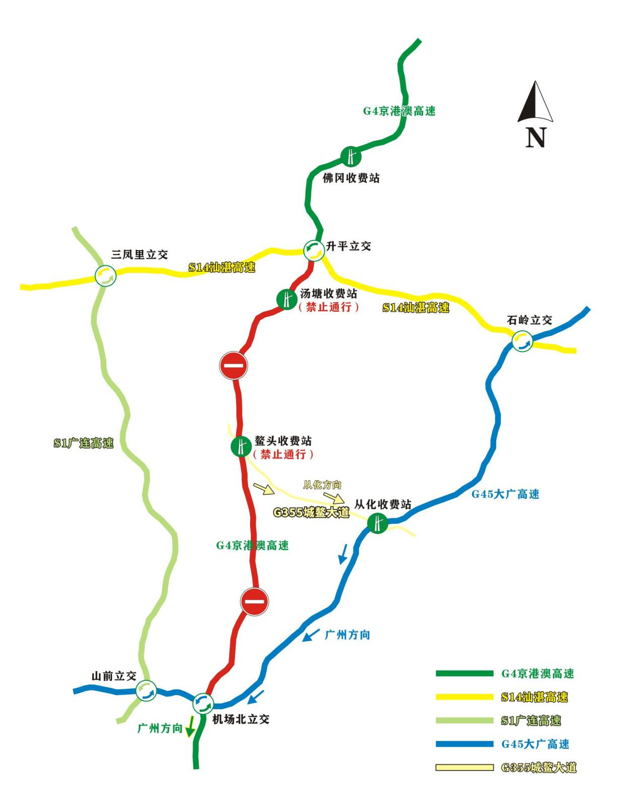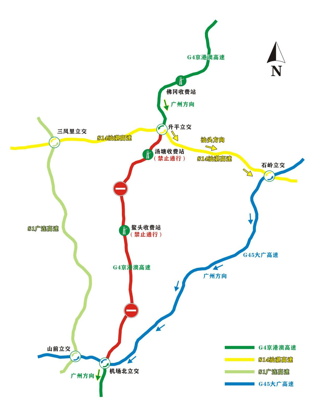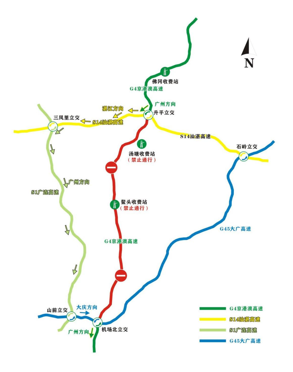 G4京港澳高速公路升平立交至机场北立交路段双向主线全封闭(42.8km),S14汕湛高速转G4京港澳高速公路广州方向匝道、G45大广高速转G4京港澳高速公路湖南方向匝道、G4京港澳高速公路汤塘收费站及鳌头收费站,禁止所有车辆通行。