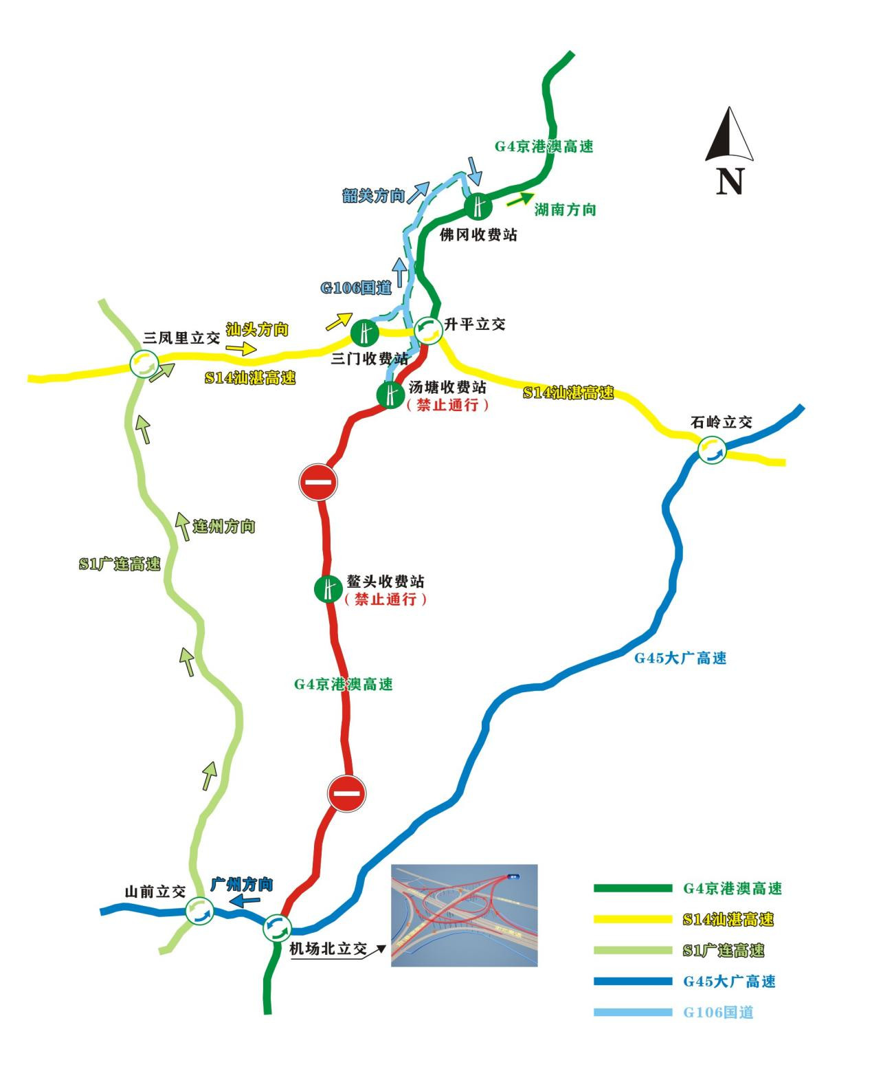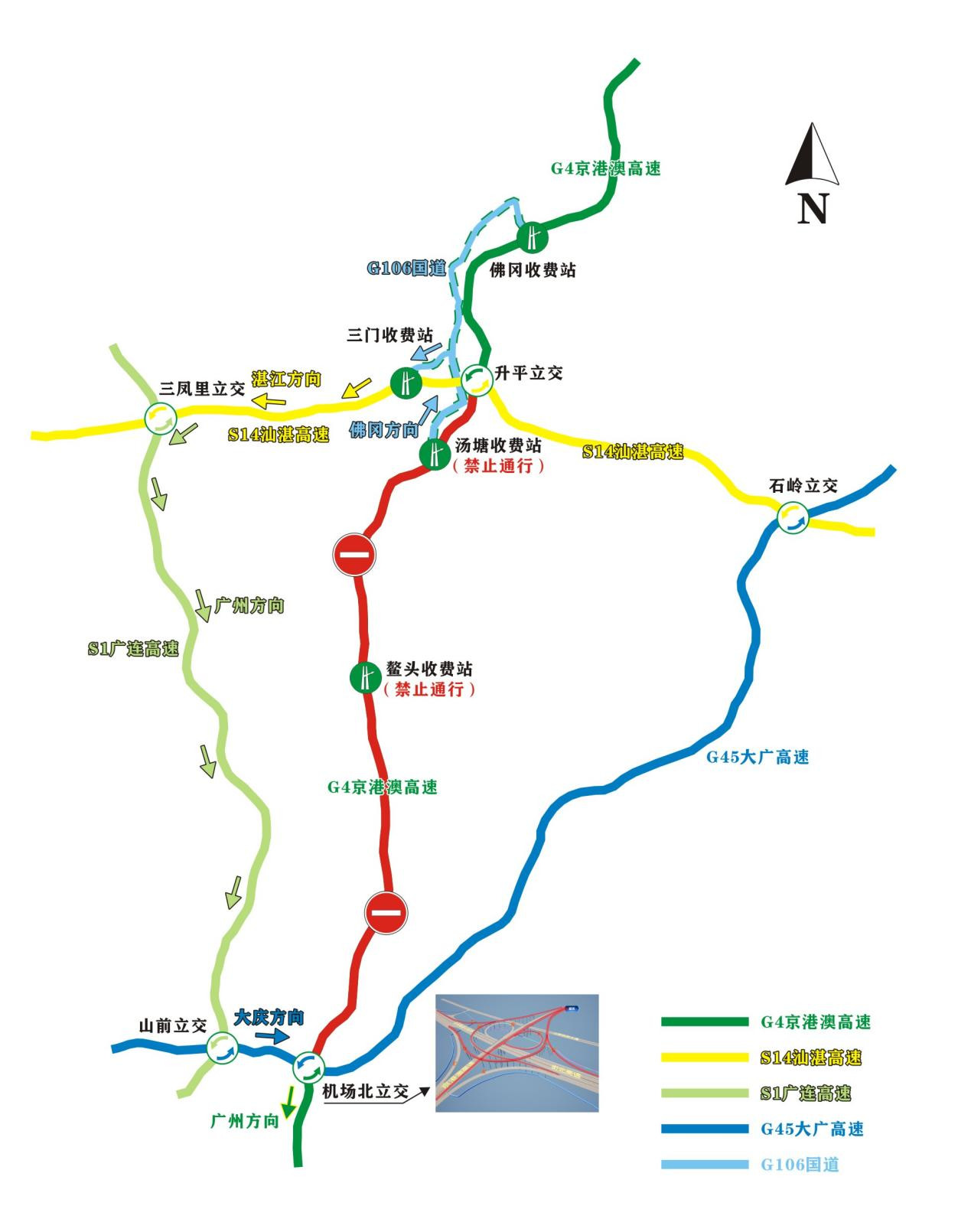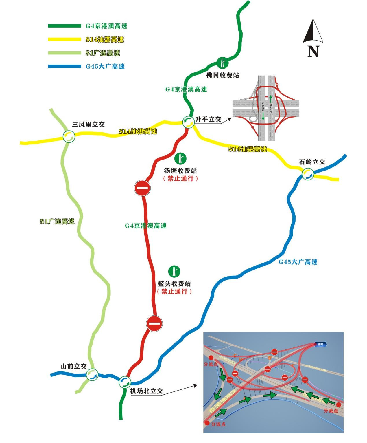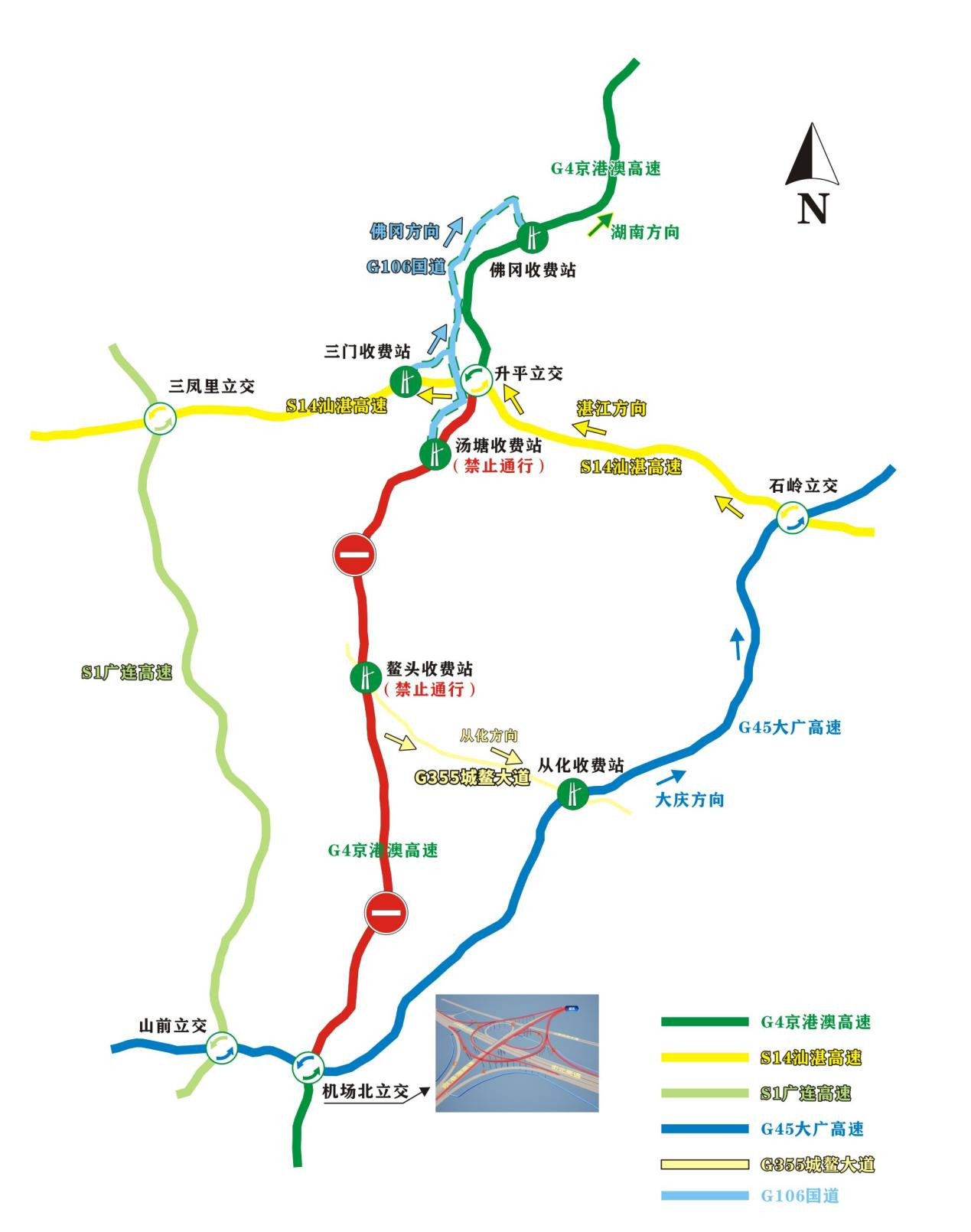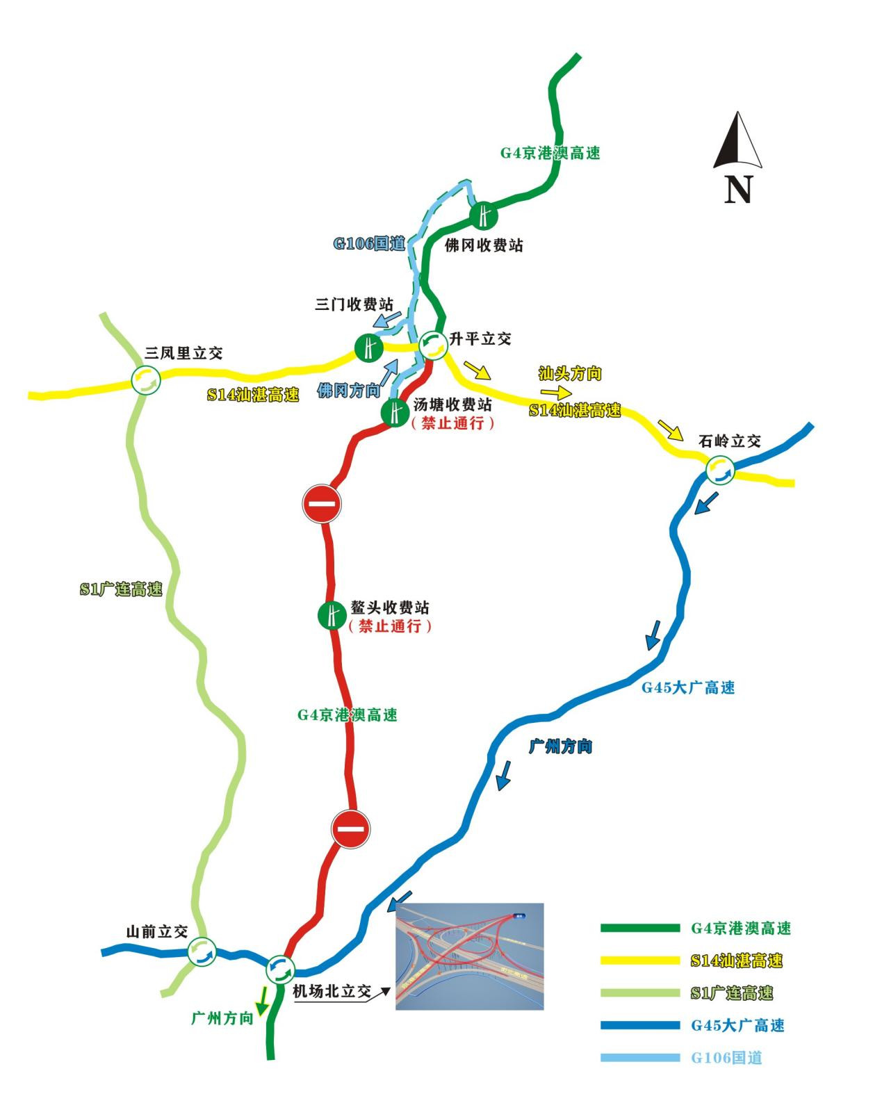 G4京港澳高速公路升平立交至机场北立交路段双向主线全封闭(42.8km),S14汕湛高速转G4京港澳高速公路广州方向匝道、G45大广高速转G4京港澳高速公路湖南方向匝道、G4京港澳高速公路汤塘收费站及鳌头收费站,禁止所有车辆通行。