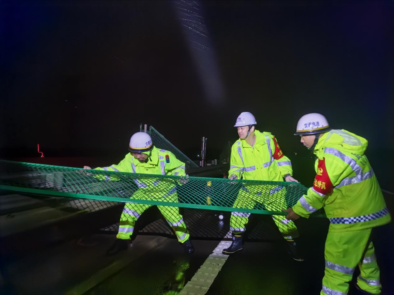 渝湛、湛徐高速抢险队员清理被风吹落的防抛网和预告牌