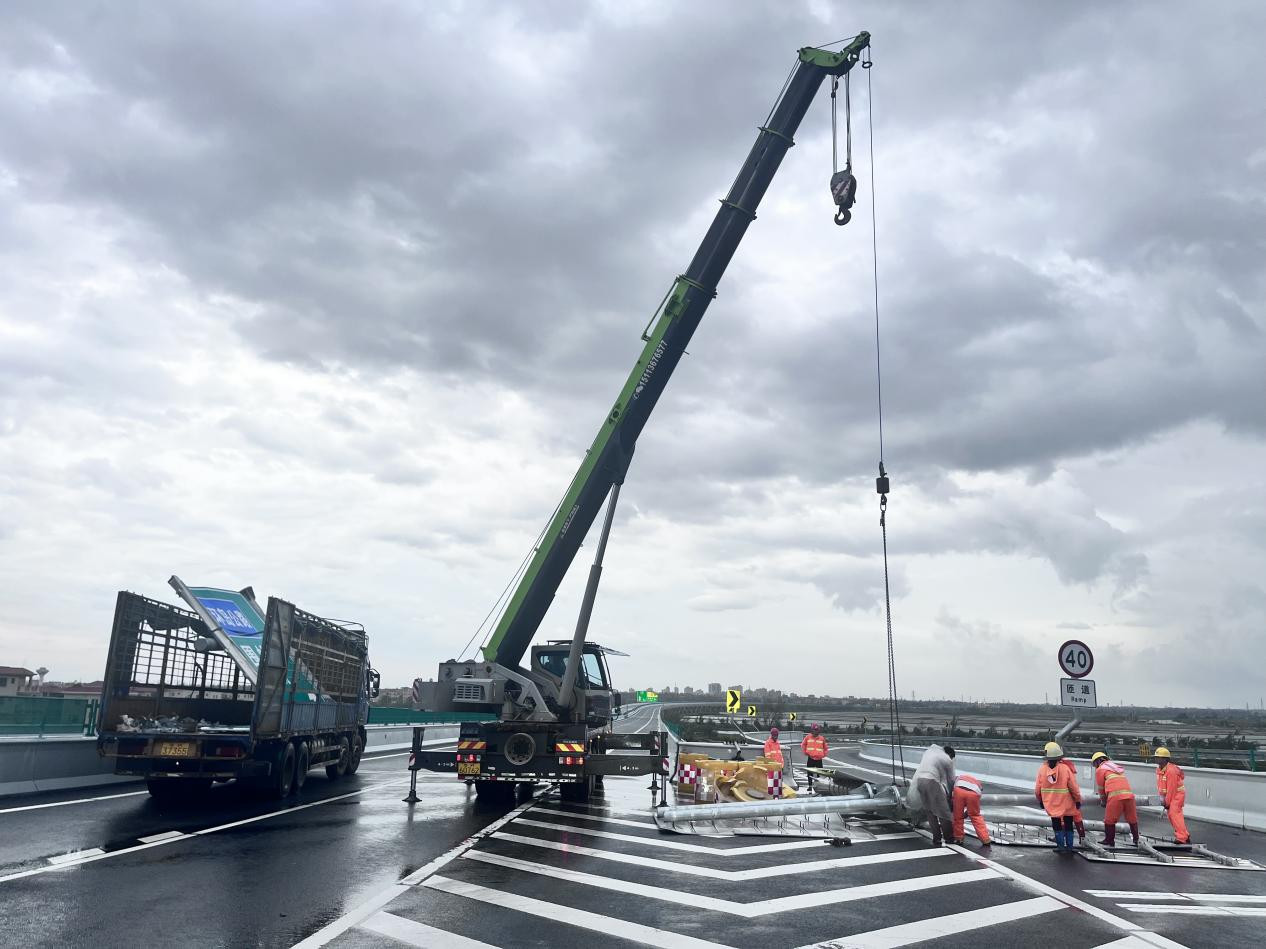 南三岛大桥养护人员利用起重设备处置倒伏标志牌
