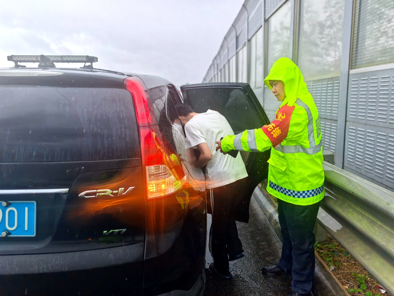 “师傅,您的车怎么停在这儿?太危险了!”当天上午,包茂路政一中队队长唐培省与队员正开展台风前巡查,行至茂湛高速往广州方向K3373+600M时,发现一台面包车打着双闪灯停在路肩处,于是前去问询情况。