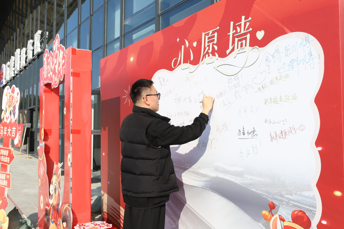 “2026年,愿家人平安顺遂”“新的一年,奔赴热爱”……活动现场,新年心愿打卡墙前围满了拍照留念的旅客,五彩的写字笔写满了墙面;投壶纳福区不时传来阵阵欢笑,孩子们踮着脚尖,专注地将箭矢投入壶中;一旁的套圈集福游戏也排起了长队,参与者们小心翼翼地抛出圆圈,每当套中礼品,周围便响起喝彩声;在拓福迎新体验区,司乘在志愿者指导下,将鲜红的福字拓印在红包上……