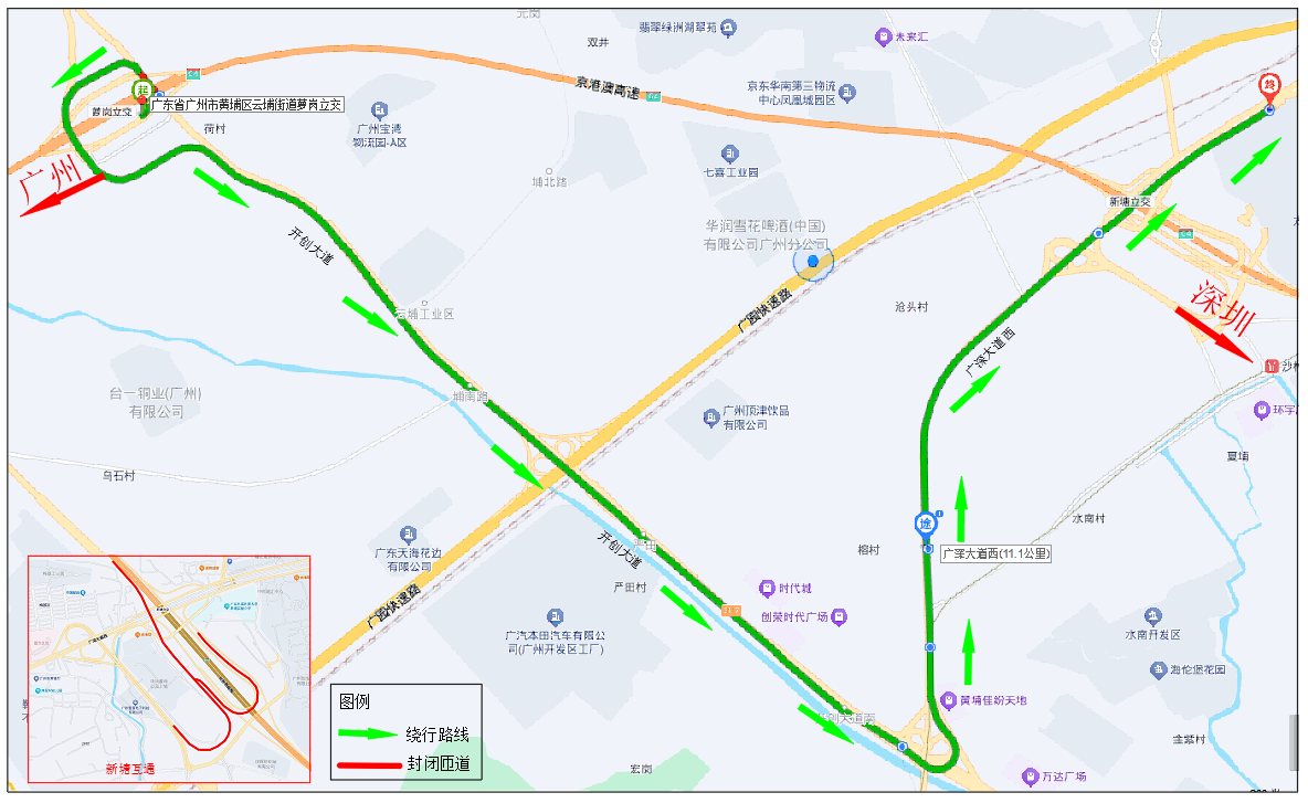 主要绕行路径一:广州往深圳方向→萝岗收费站南行出口→开创大道→广深大道西,绕行距离11.4km。