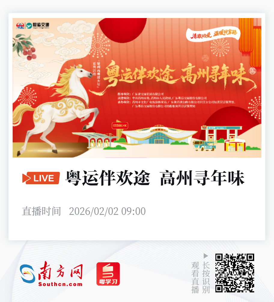 春运是归途,亦是风景。这场直播不仅是一场志愿服务启动仪式的呈现,更是广东交通人守护团圆、传递温暖的生动缩影,是高州以路为媒、激活乡村振兴活力的真实写照。锁定南方网、粤学习直播间,一起在柏桥服务区遇见春运里的烟火气与温柔,见证“清澈的爱”如何照亮每一条回家路,让这个马年春运更有温度、更具韵味。