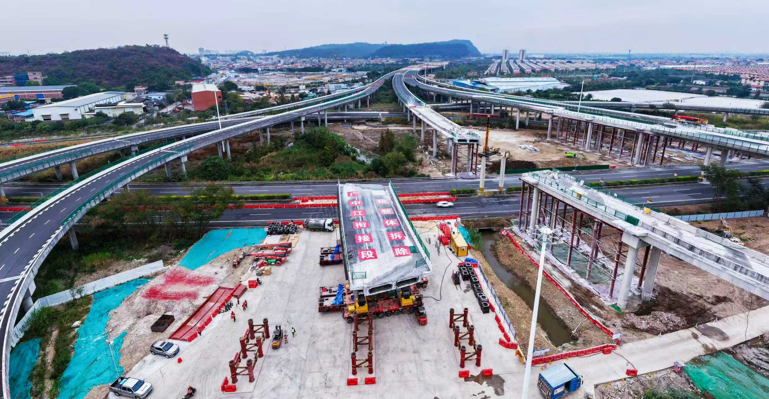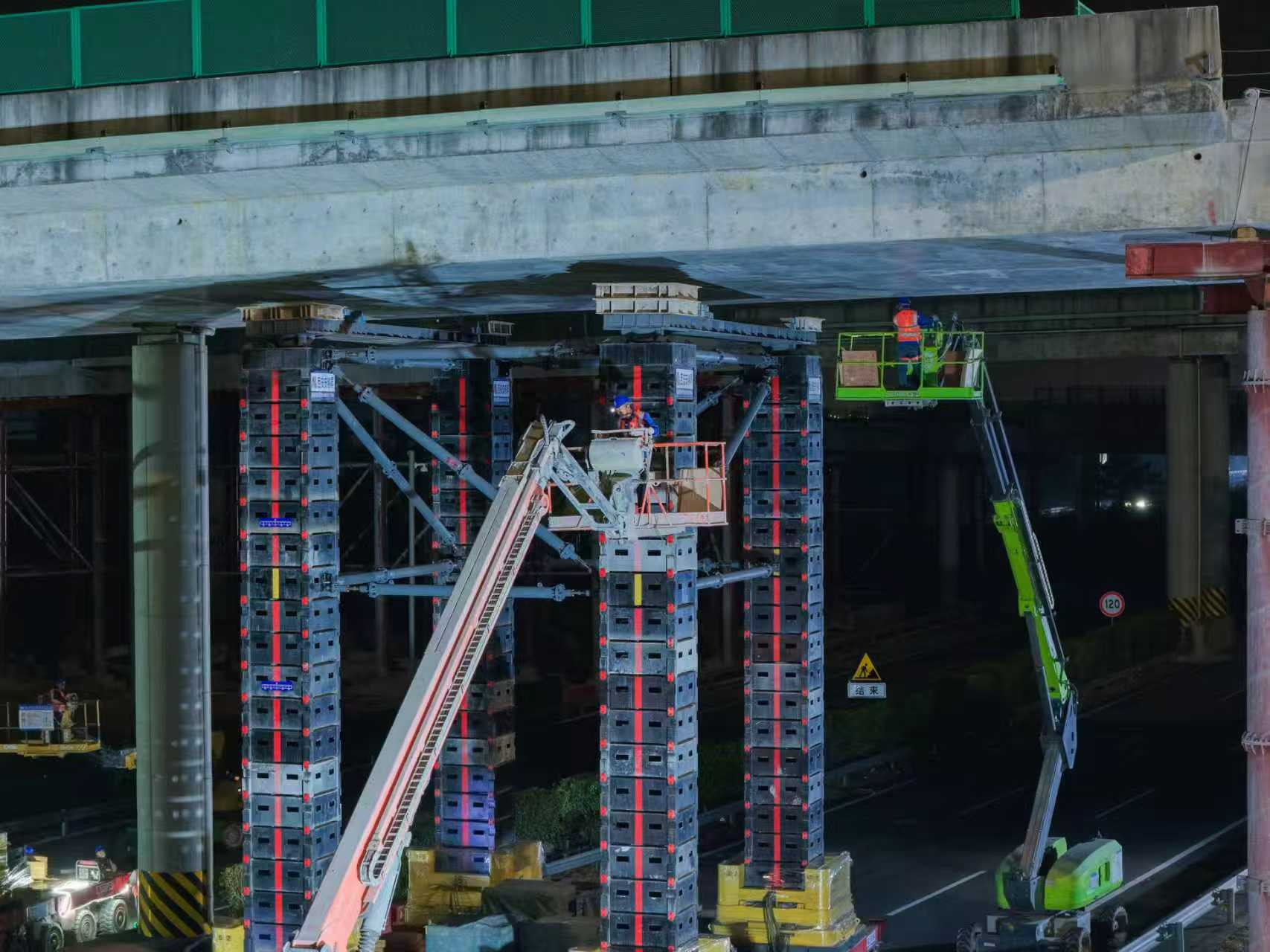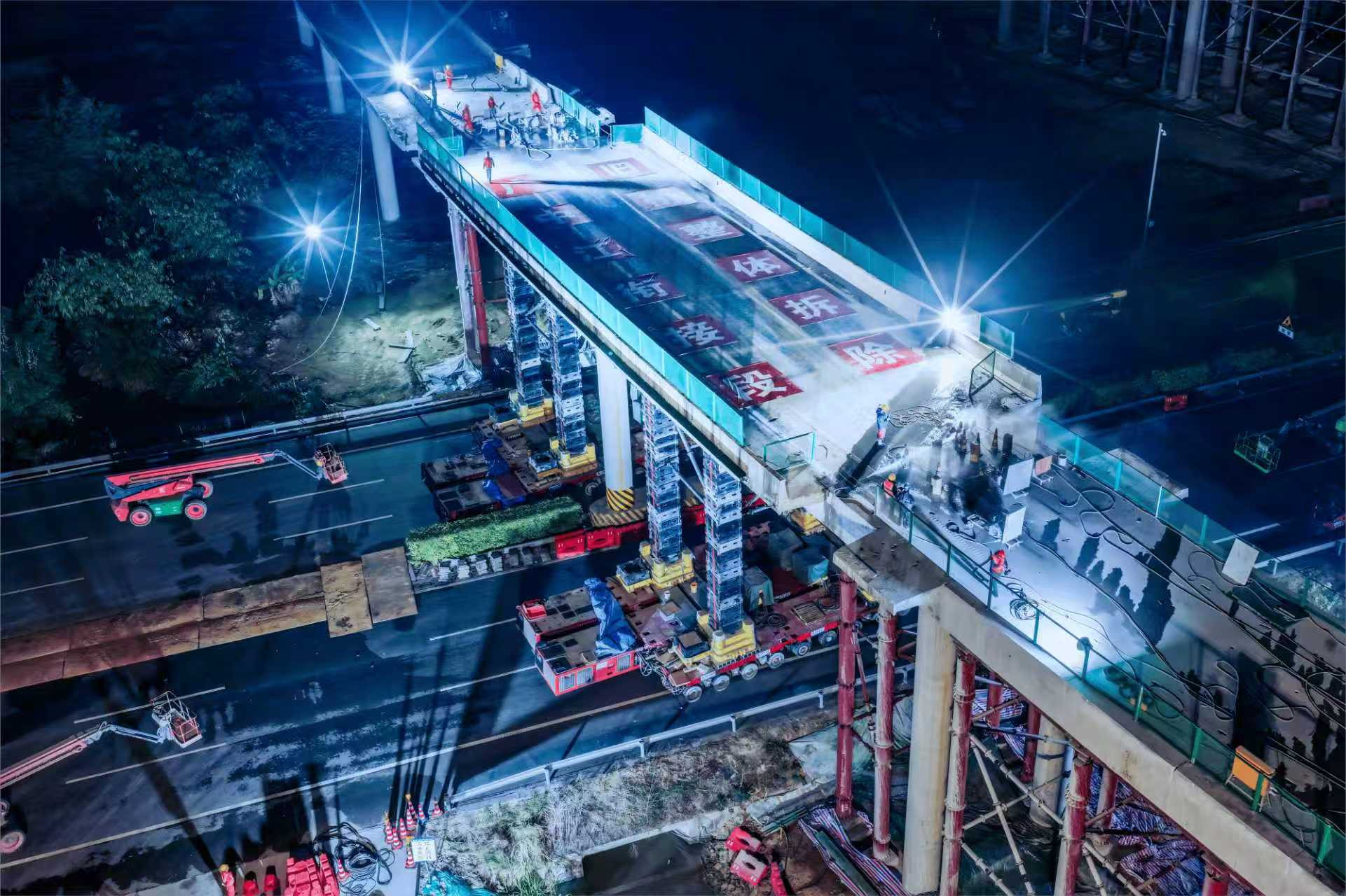 施工过程中,先用顶升设备将桥梁平稳托起,再通过模块车整体平移运出高速主线外,实现梁体“平移式”安全转运。