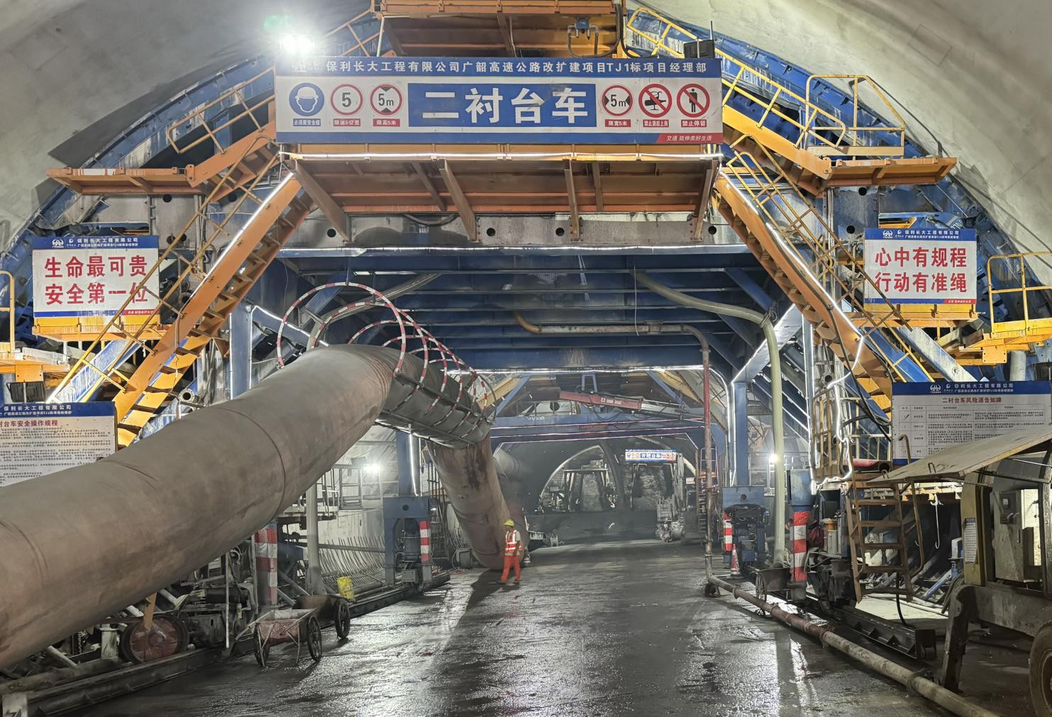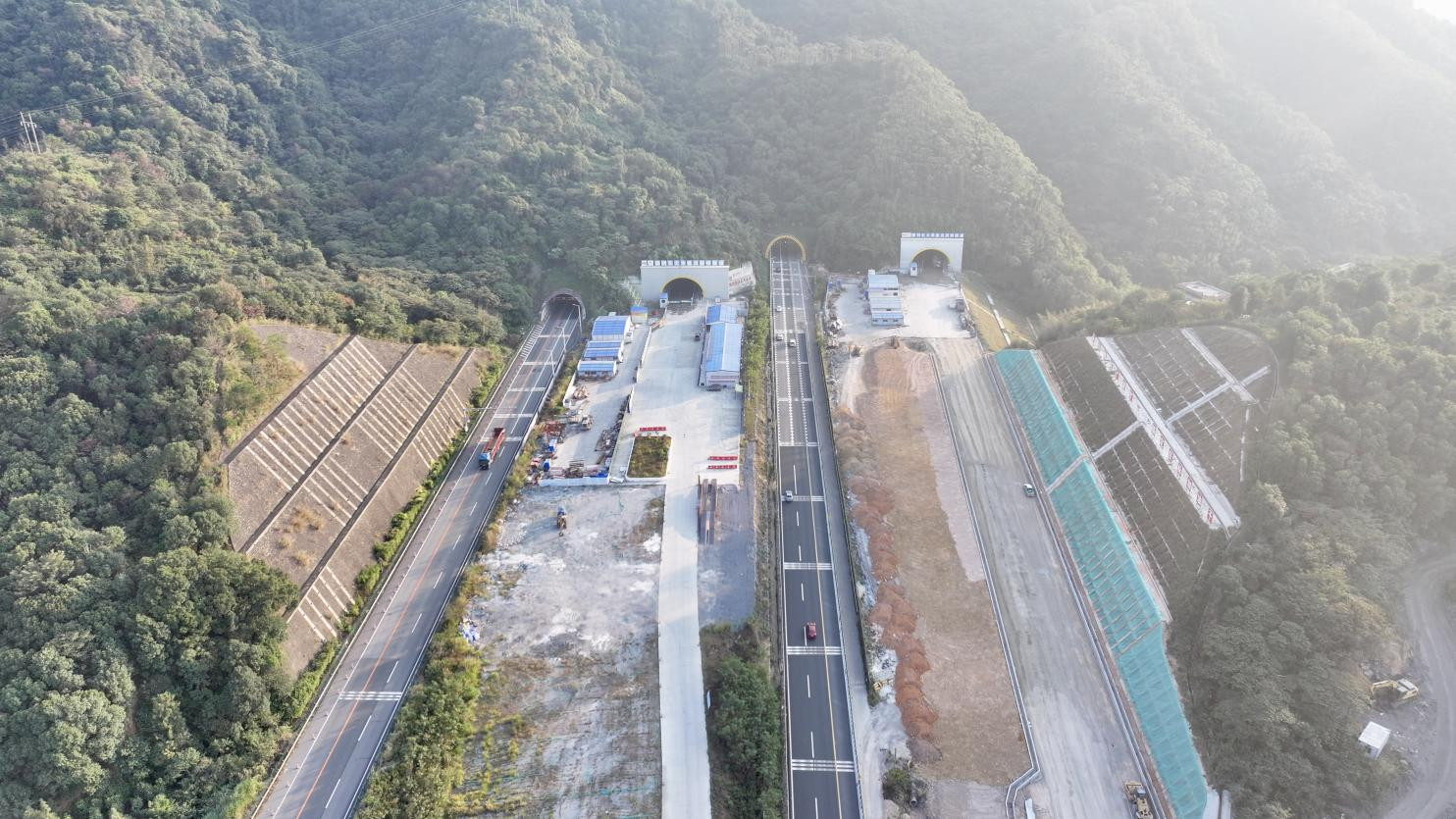 旦架哨隧道是项目全线唯一一座隧道,位于清远市佛冈县,采用“中间+西侧”增建隧道的方式,在既有隧道中间空地及西侧各新建单洞三车道隧道,较传统双侧扩建方案节约用地1.5万余平方米。