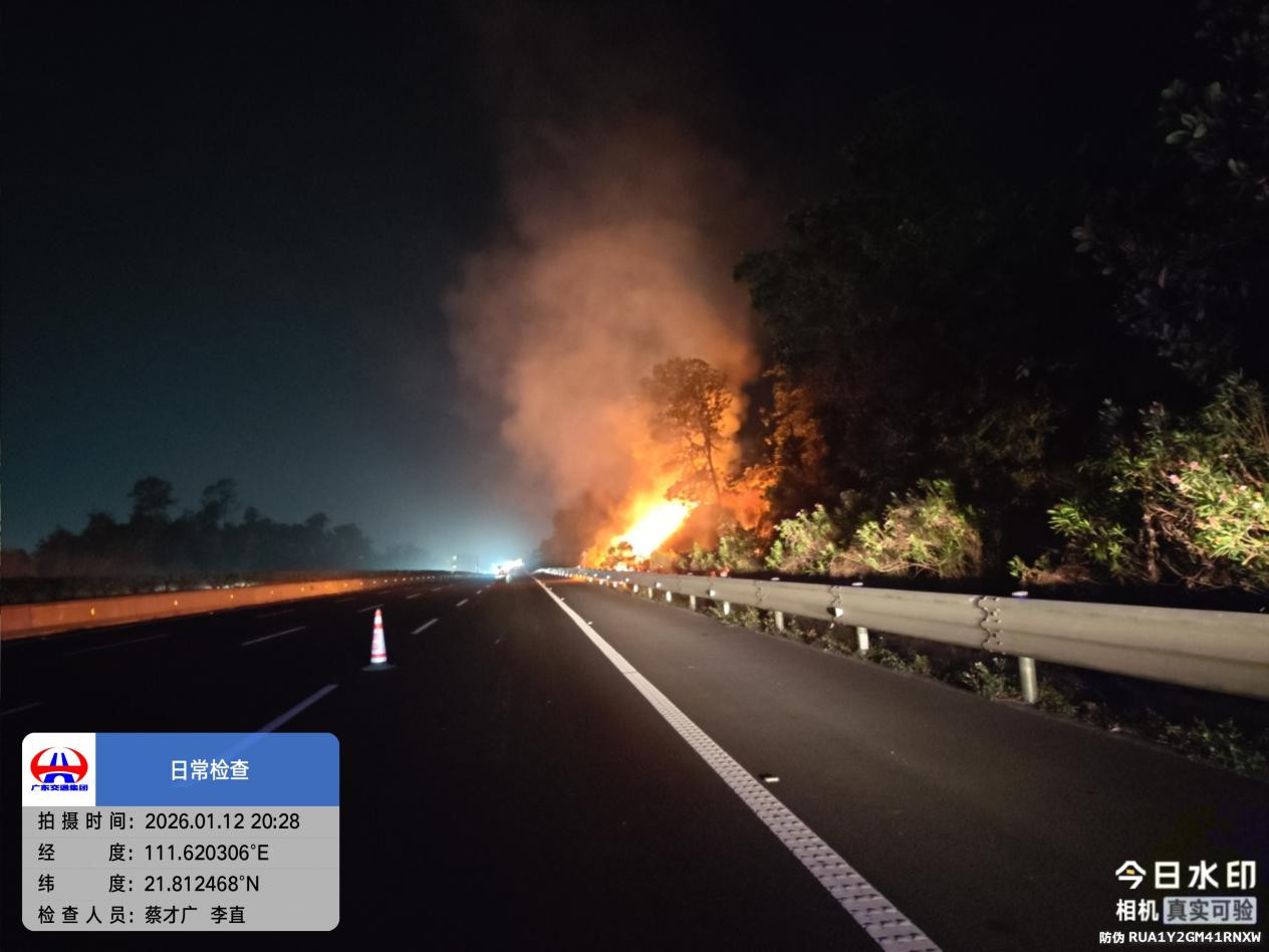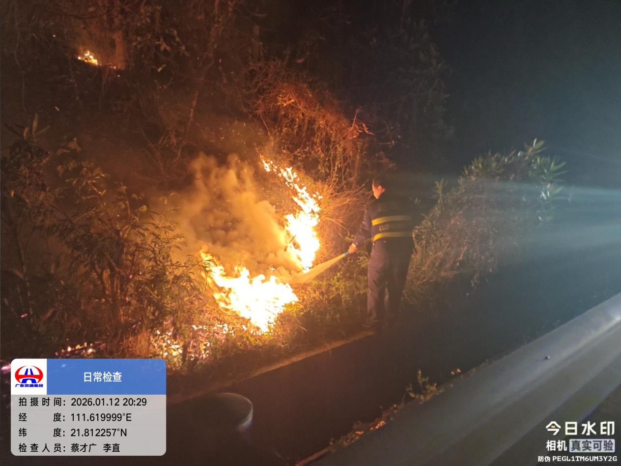 1月12日20时16分,正在阳茂高速开展日常巡查的路政员蔡才广、李直收到了监控中心的信息通知。此时,夜色中的阳茂高速路面车流不息,边坡燃起的火光在黑暗中格外刺眼,一旦火势蔓延至路面或引燃周边植被,后果不堪设想。