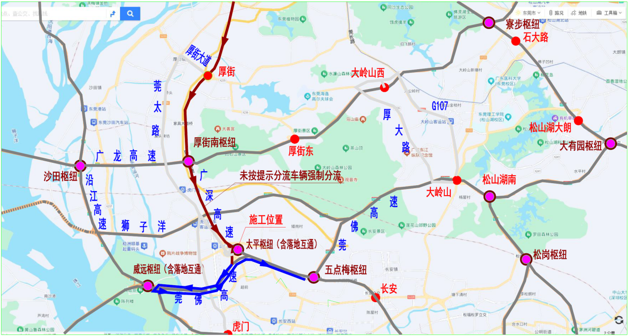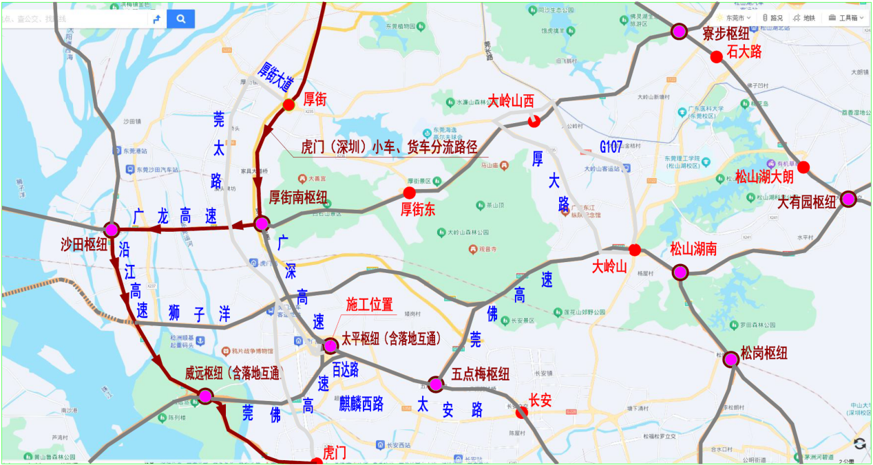 虎门和深圳方向小车、货车分流路线:广深高速行驶→厚街南枢纽→广龙高速公路→沙田枢纽→沿江高速→虎门或深圳方向。