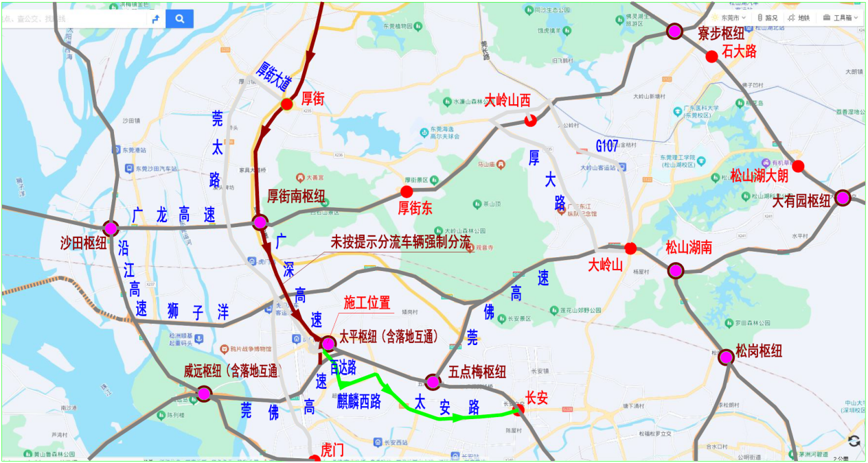 3、广深高速→太平收费站→百达路→麒麟西路→太安路→长安收费站。(货车分流)