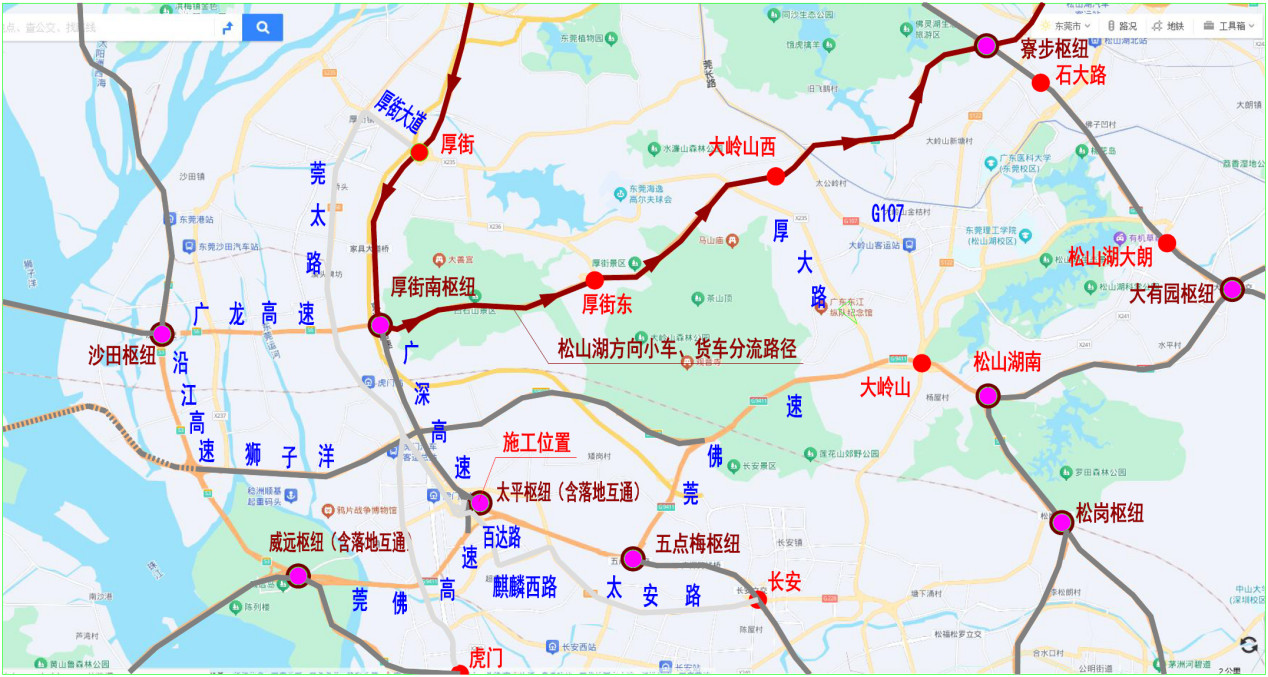 2、东行(松山湖)方向客、货车分流路线:广深高速→厚街南枢纽→广龙高速公路→大岭山西收费站→松山湖等地方