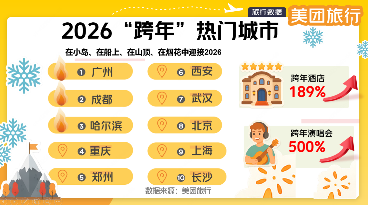 跨年夜追光等“夜游”带动酒店住宿等一系列文旅消费。美团旅行数据显示,截至12月21日,2026元旦文旅预订增速达117%。广州、成都、哈尔滨、重庆、郑州、西安、武汉、北京、上海、长沙成为“跨年”热门城市前十名。美团旅行上线“尽兴跨大年·5折玩个遍”元旦大促,活动覆盖全国200余个城市,上万家景区、酒店、机票、火车票、跟团游跨年特惠低至5折,还有跨年免单、出游大额券包等新年福利,让游客轻松拥有美好旅程。