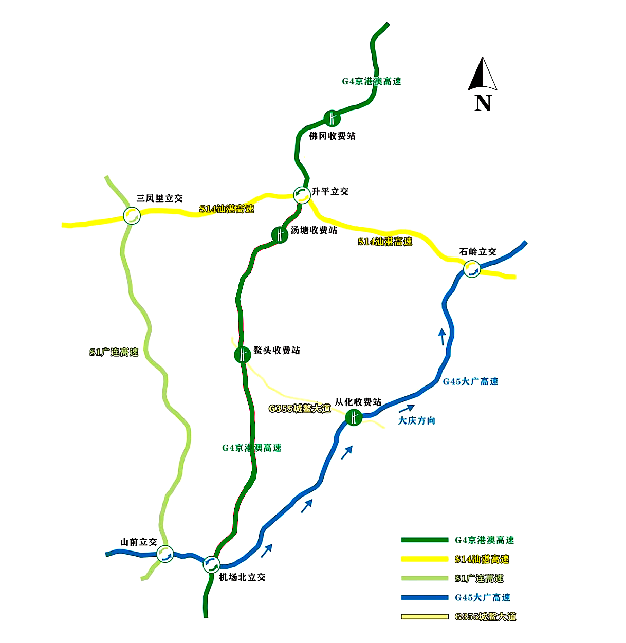 远端绕行路线二:京港澳高速往湖南方向→机场北枢纽立交→大广高速往广州方向→山前枢纽立交→广连高速往连州方向→驶入三凤里枢纽立交→汕湛高速往汕头/湛江方向(全长42.8公里)