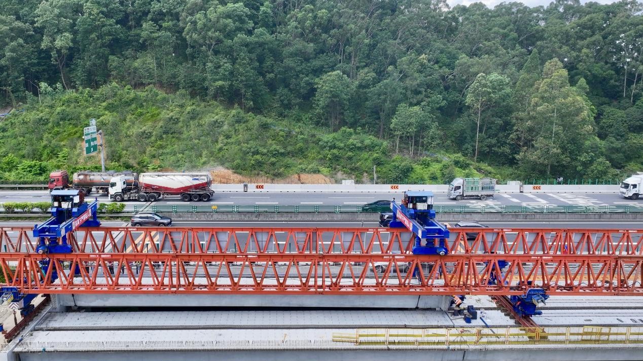 经过3个月的紧张施工,9月7日15时,随着最后一片长30米、重90吨的箱梁平稳精准落位在桥墩支座上,广东交通集团所属广韶高速改扩建项目(南段)和龙高架桥左幅94片箱梁全部架设完毕,标志着桥梁左幅实现贯通。