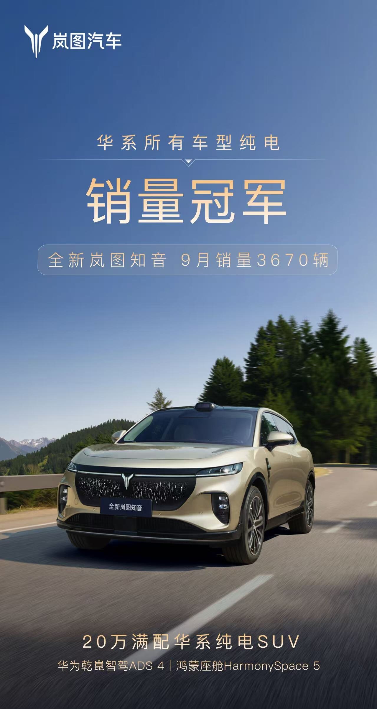 据中国银行保险监督管理委员会上险量数据统计,刚刚完成上市仅1个月的全新岚图知音展现出了强劲市场爆发力,2025年9月以3670辆的终端上险数据,成功问鼎所有华为系纯电车型销量冠军,实力超越智界R7(3050辆)、阿维塔07(2550辆)、问界M8(2490辆)等一众华为系热销车型,成为名副其实的华系纯电销冠。